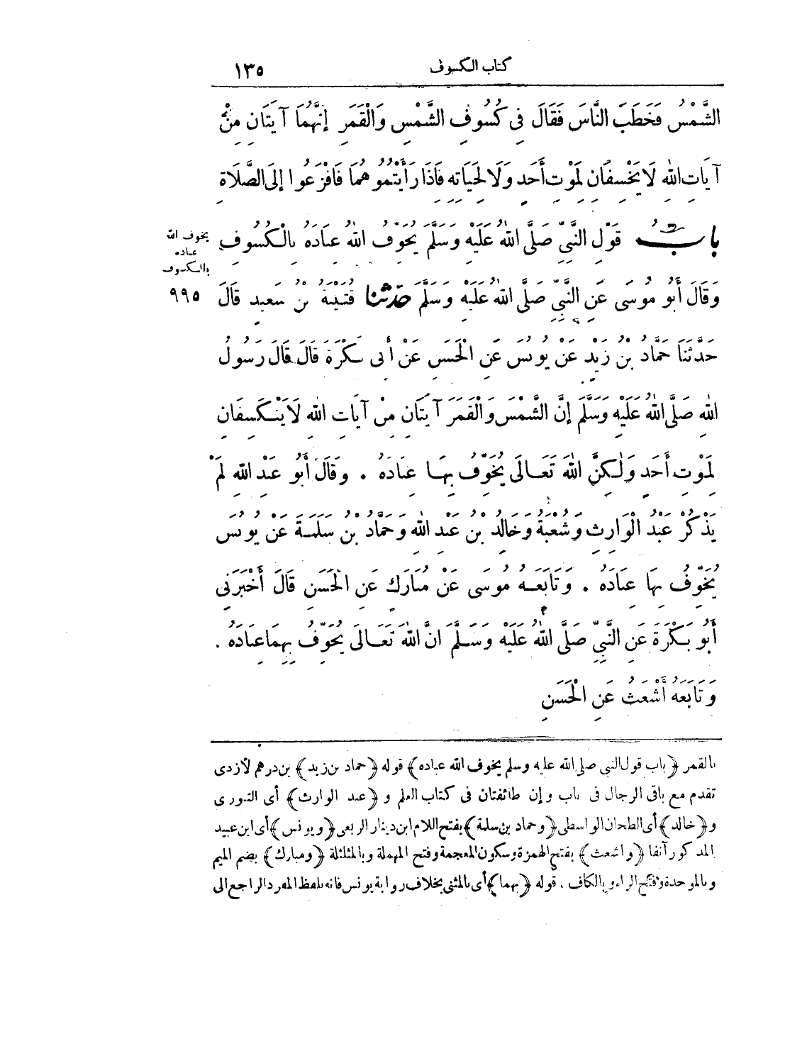 995 - حَدَّثَنَا قُتَيْبَةُ بْنُ سَعِيدٍ قَالَ حَدَّثَنَا حَمَّادُ بْنُ زَيْدٍ عَنْ يُونُسَ عَنْ الْحَسَنِ عَنْ أَبِي بَكْرَةَ قَالَ قَالَ رَسُولُ اللَّهِ صَلَّى اللَّهُ عَلَيْهِ وَسَلَّمَ إِنَّ الشَّمْسَ وَالْقَمَرَ آيَتَانِ مِنْ آيَاتِ اللَّهِ لَا يَنْكَسِفَانِ لِمَوْتِ أَحَدٍ وَلَكِنَّ اللَّهَ تَعَالَى يُخَوِّفُ بِهَا عِبَادَهُ وَقَالَ أَبُو عَبْد اللَّهِ وَلَمْ يَذْكُرْ عَبْدُ الْوَارِثِ وَشُعْبَةُ وَخَالِدُ بْنُ عَبْدِ اللَّهِ وَحَمَّادُ بْنُ سَلَمَةَ عَنْ يُونُسَ يُخَوِّفُ بِهَا عِبَادَهُ وَتَابَعَهُ مُوسَى عَنْ مُبَارَكٍ عَنْ الْحَسَنِ قَالَ أَخْبَرَنِي أَبُو بَكْرَةَ عَنْ النَّبِيِّ صَلَّى اللَّهُ عَلَيْهِ وَسَلَّمَ إِنَّ اللَّهَ تَعَالَى يُخَوِّفُ بِهِمَا عِبَادَهُ وَتَابَعَهُ أَشْعَثُ عَنْ الْحَسَنِ