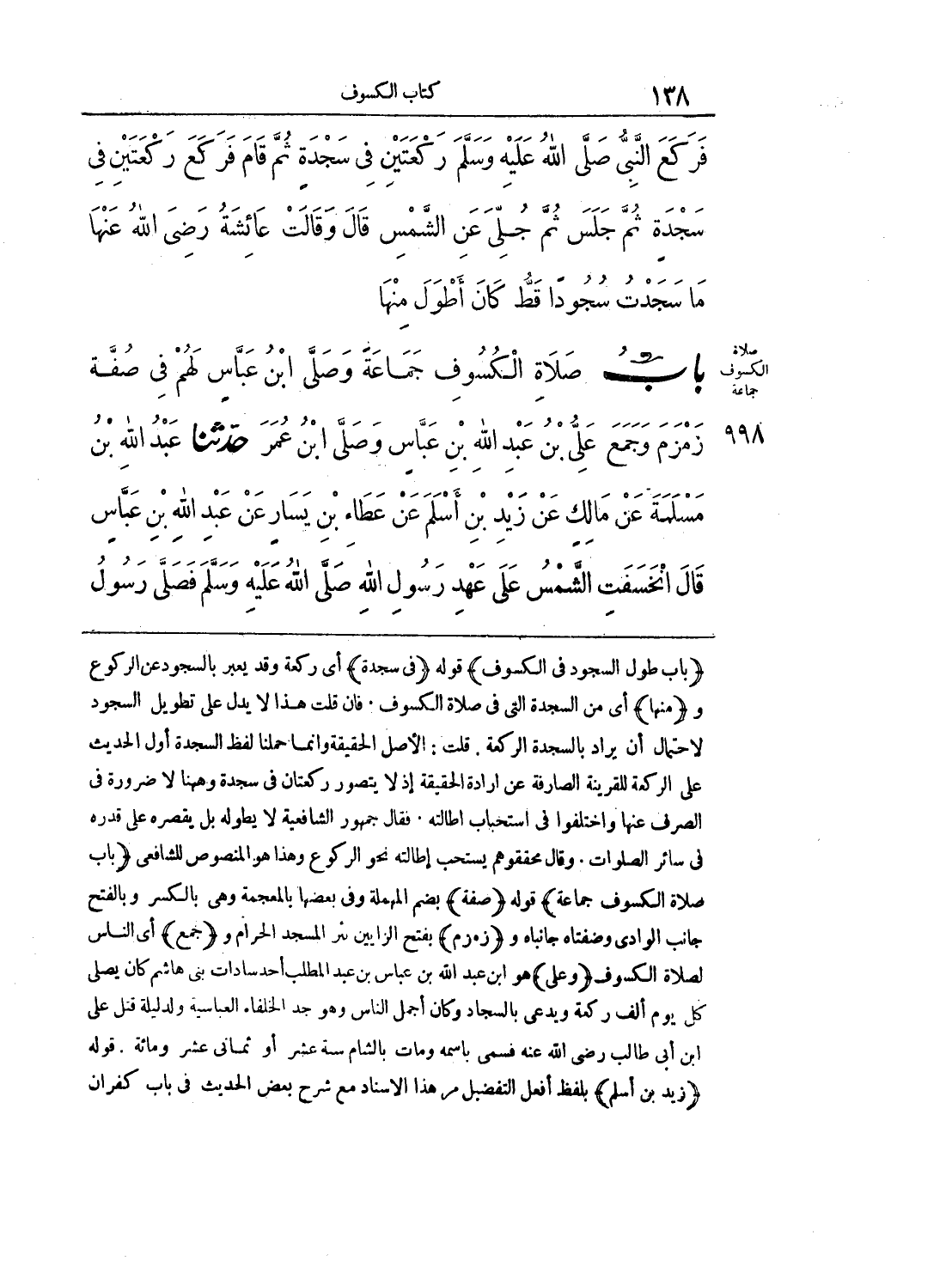 ((باب طول السجود في الكسوف)) قوله ((في سجدة)) أي ركعة وقد يعبر بالسجود عن الركوع و ((منها)) أي من السجدة التي في صلاة الكسوف, فإن قلت هذا لا يدل على تطويل السجود لاحتمال أن يراد بالسجدة الركعة, قلت: الأصل الحقيقة وإنما حملنا لفظ السجدة أول الحديث على الركعة للقرينة الصارفة عن إرادة الحقيقة إذ لا يتصور ركعتان في سجدة وههنا لا ضرورة في الصرف عنها واختلفوا في استحباب إطالته, فقال جمهور الشافعية لا يطوله بل يقصره على قدره في سائر الصلوات, وقال محققوهم يستحب إطالته نحو الركوع وهذا هو المنصوص للشافعي ((باب صلاة الكسوف جماعة)) قوله ((صفة)) بضم المهملة وفي بعضها بالمعجمة وهي بالكسر وبالفتح جانب الوادي وضفتاه جانباه و ((زمزم)) بفتح الزايين بئر المسجد الحرام و ((جمع)) أي الناس لصلاة الكسوف ((وعلى)) هو ابن عبد الله بن عباس بن عبد المطلب أحد سادات بني هاشم كان يصلي كل يوم ألف ركعة ويدعي بالسجاد وكان أجمل الناس وهو جد الخلفاء العباسية ولدليلة قتل علي ابن أبي طالب رضي الله عنه فسمي باسمه ومات بالشام سنة عشر أو ثماني عشر ومائة, قوله ((زيد بن أسلم)) بلفظ أفعل التفضيل مر هذا الإسناد مع شرح بعض الحديث في باب كفران