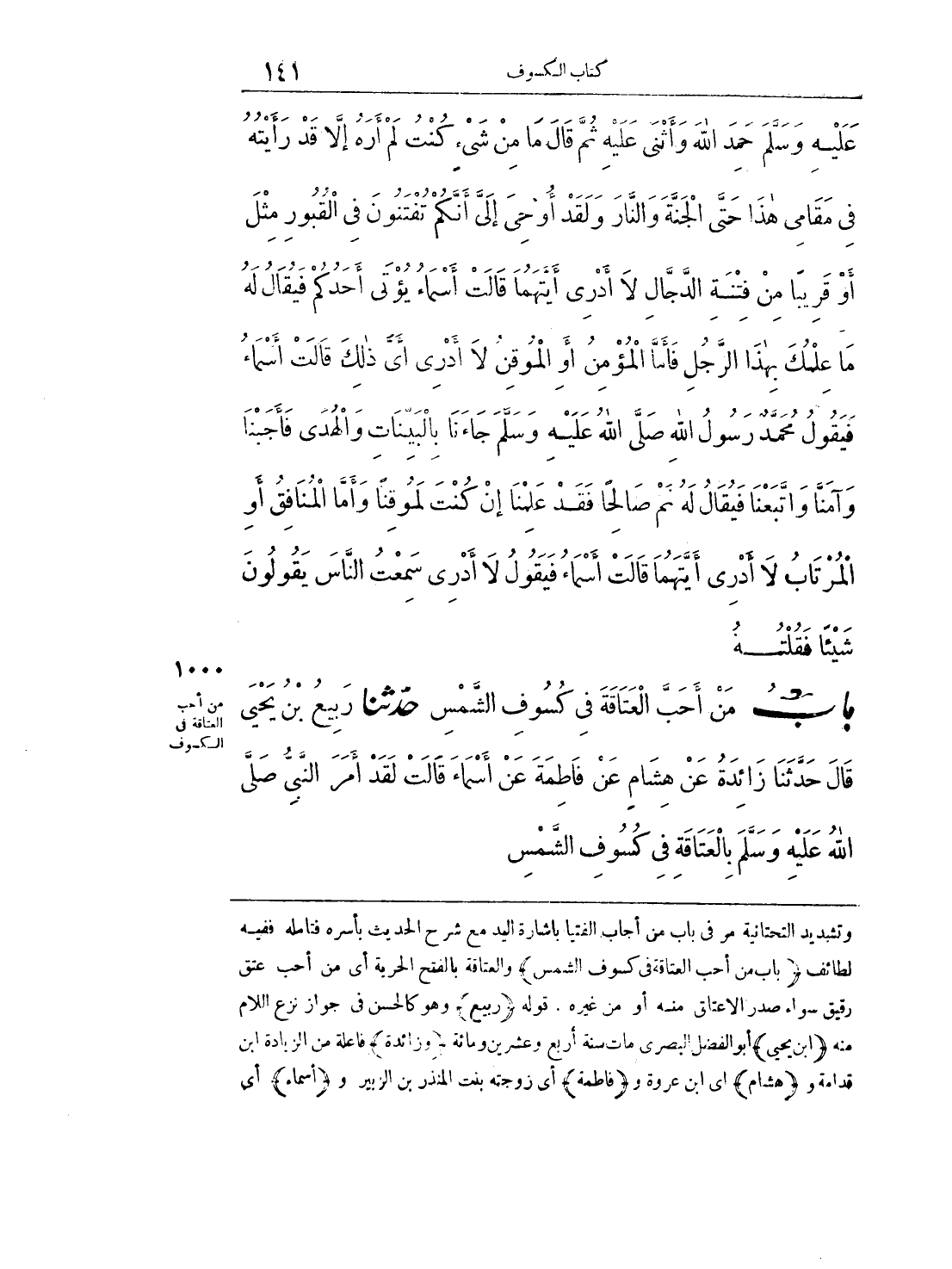 1000 - حَدَّثَنَا رَبِيعُ بْنُ يَحْيَى قَالَ حَدَّثَنَا زَائِدَةُ عَنْ هِشَامٍ عَنْ فَاطِمَةَ عَنْ أَسْمَاءَ قَالَتْ لَقَدْ أَمَرَ النَّبِيُّ صَلَّى اللَّهُ عَلَيْهِ وَسَلَّمَ بِالْعَتَاقَةِ فِي كُسُوفِ الشَّمْسِ