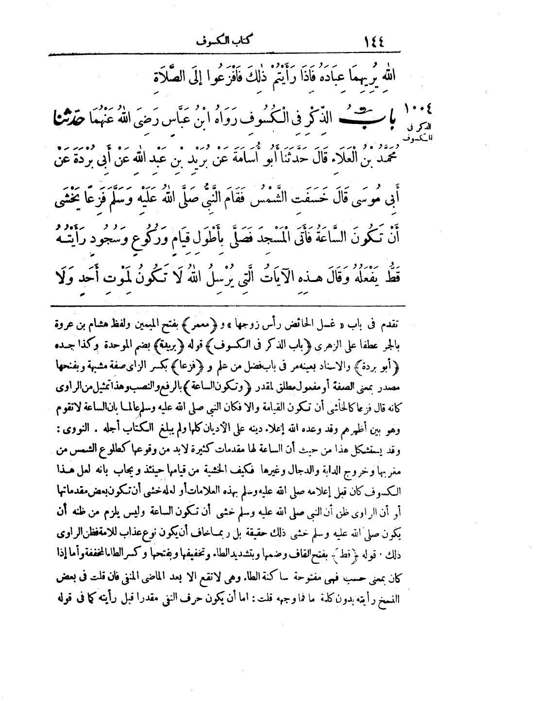 تقدم في باب «غسل الحائض رأس زوجها» و ((معمر)) بفتح الميمين ولفظ هشام بن عروة بالجر عطفا على الزهري ((باب الذكر في الكسوف)) قوله ((بريدة)) بضم الموحدة وكذا جده ((أبو بردة)) والإسناد بعينه مر في باب فضل من علم و ((فزعا)) بكسر الزاي صفة مشبهة وبفتحها مصدر بمعنى الصفة أو مفعول مطلق لمقدر ((وتكون الساعة)) بالرفع والنصب وهذا تمثيل من الراوي كأنه قال فزعا كالخاشي أن تكون القيامة وإلا فكان النبي صلى الله عليه وسلم عالما بأن الساعة لا تقوم وهو بين أظهرهم وقد وعده الله إعلاء دينه على الأديان كلها ولم يبلغ الكتاب أجله, النووي: وقد يستشكل هذا من حيث أن الساعة لها مقدمات كثيرة لابد من وقوعها كطلوع الشمس من مغربها وخروج الدابة والدجال وغيرها فكيف الخشية من قيامها حينئذ ويجاب بأنه لعل هذا الكسوف كان قبل إعلامه صلى الله عليه وسلم بهذه العلامات أو لعله خشي أن تكون بعض مقدماتها أو أن الراوي ظن أن النبي صلى الله عليه وسلم خشي أن تكون الساعة وليس يلزم من ظنه أن يكون صلى الله عليه وسلم خشي ذلك حقيقة بل ربما خاف أن يكون نوع عذاب للأمة فظن الراوي ذلك, قوله ((قط)) بفتح القاف وضمها وبتشديد الطاء وتخفيفها وبفتحها وكسر الطاء المخففة وأما إذا كان بمعنى حسب فهي مفتوحة ساكنة الطاء وهي لا تقع إلا بعد الماضي المنفي فإن قلت في بعض النسخ رأيته بدون كلمة ما فما وجهه قلت: إما أن يكون حرف النفي مقدرا قبل رأيته كما في قوله