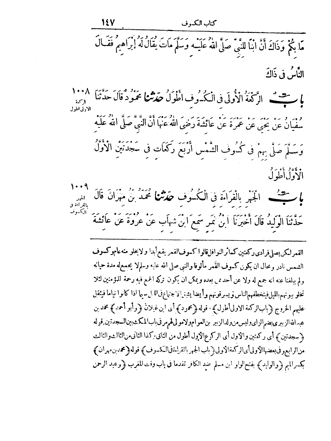 القمر لكن يصلي فرادى ركعتين كسائر النوافل قالوا كسوف القمر يقع أبدا ولا يخلو منه عام وكسوف الشمس نادر ومحال أن يكون كسوف القمر مألوفا والنبي صلى الله عليه وسلم لا يجمع له مدة حياته ولم يبلغنا عنه انه جمع له ولا عن أحد ممن بعده ويمكن أن يكون تركه الجمع فيه رحمة للمؤمنين لئلا تخلو بيوتهم بالليل فيتخطفهم الناس ويسرقونهم وأيضا يشق الاجتماع في الليل سيما إذا كانوا نياما فيثقل عليهم الخروج ((باب الركعة الأولى أطول)) , قوله ((محمود)) أي ابن غيلان ((وأبو أحمد)) محمد بن عبد الله الزبيري بضم الزاي وليس من ولد الزبير بن العوام ولا مولى لهم مر في باب المكث بين السجدتين, قوله ((سجدتين)) أي ركعتين والأول أي الركوع الأول أطول من الثاني وكذا الثاني من الثالث والثالث من الرابع وفي بعضها الأولى أي الركعة الأولى ((باب الجهر بالقراءة في الكسوف)) قوله ((محمد بن مهران)) بكسر الميم ((والوليد)) بفتح الواو ابن مسلم ضد الكافر تقدما في باب وقت المغرب ((وعبد الرحمن