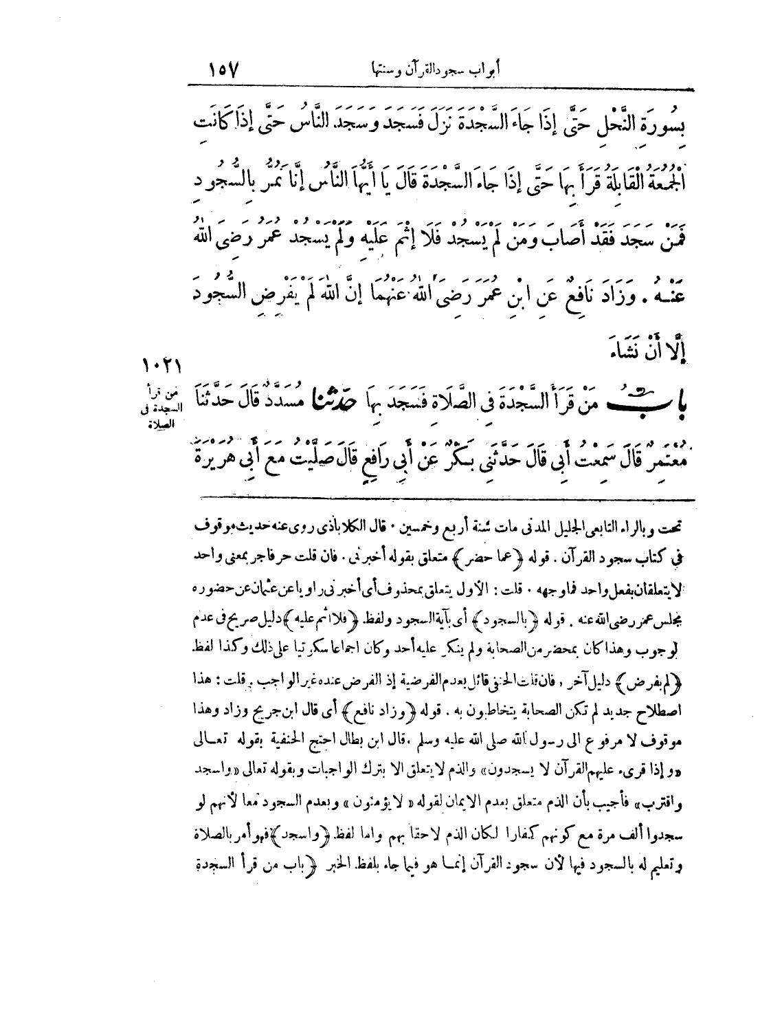 تحت وبالراء التابعي الجليل المدني مات سنة أربع وخمسين. قال الكلاباذي روى عنه حديث موقوف في كتاب سجود القرآن. قوله (عما حضر) متعلق بقوله أخبرني. فإن قلت حرفا جر بمعنى واحد لا يتعلقان بفعل ولحد فما وجهه. قلت: الأول يتعلق بمحذوف أي أخبرني راويا عن عثمان عن حضوره مجلس عمر رضي الله عنه. قوله (بالسجود) أي بآية السجود ولفظ (فلا إثم عليه) دليل صريح في عدم الوجوب وهذا كلن بمحضر الصحابة ولم ينكر عليه أحد وكان إجماعاً سكوتياً على ذلك وكذا لفظ (ولم يفرض) دليل آخر، فإن قلت الحنفي قائل بعدم الفرضية إذ الفرض عنده غير الواجب. قلت: هذا اصطلاح جديد لم تكن الصحابة يتخاطبون به. قوله (وزاد نافع) أي قال ابن جريج وزاد هذا موقوف لا مرفوع 'لى رسول الله صلى الله عليه وسلم. قال ابن بطال: احتج الحنفية بقوله تعالى «وإذا قرئ عليهم القرآن لا يسجدون» والذم لا يتعلق إلا بترك الواجبات وبقوله «واسجد واقترب» فأجيب بان الذم متعلق بعدم الإيمان لقوله «لا يؤمنون» وبعدم السجود معا لأنهم لو سجدوا ألف مرة مع كونهم كفاراً لكان الذم لاحقاً بهم وأمل لفظ (واسجد) فهو أمر بالصلاة وتعليم له بالسجود فيها لأن سجود القرآن إنما هو فيما جاء بلفظ الخبر (باب من قرأ السجدة