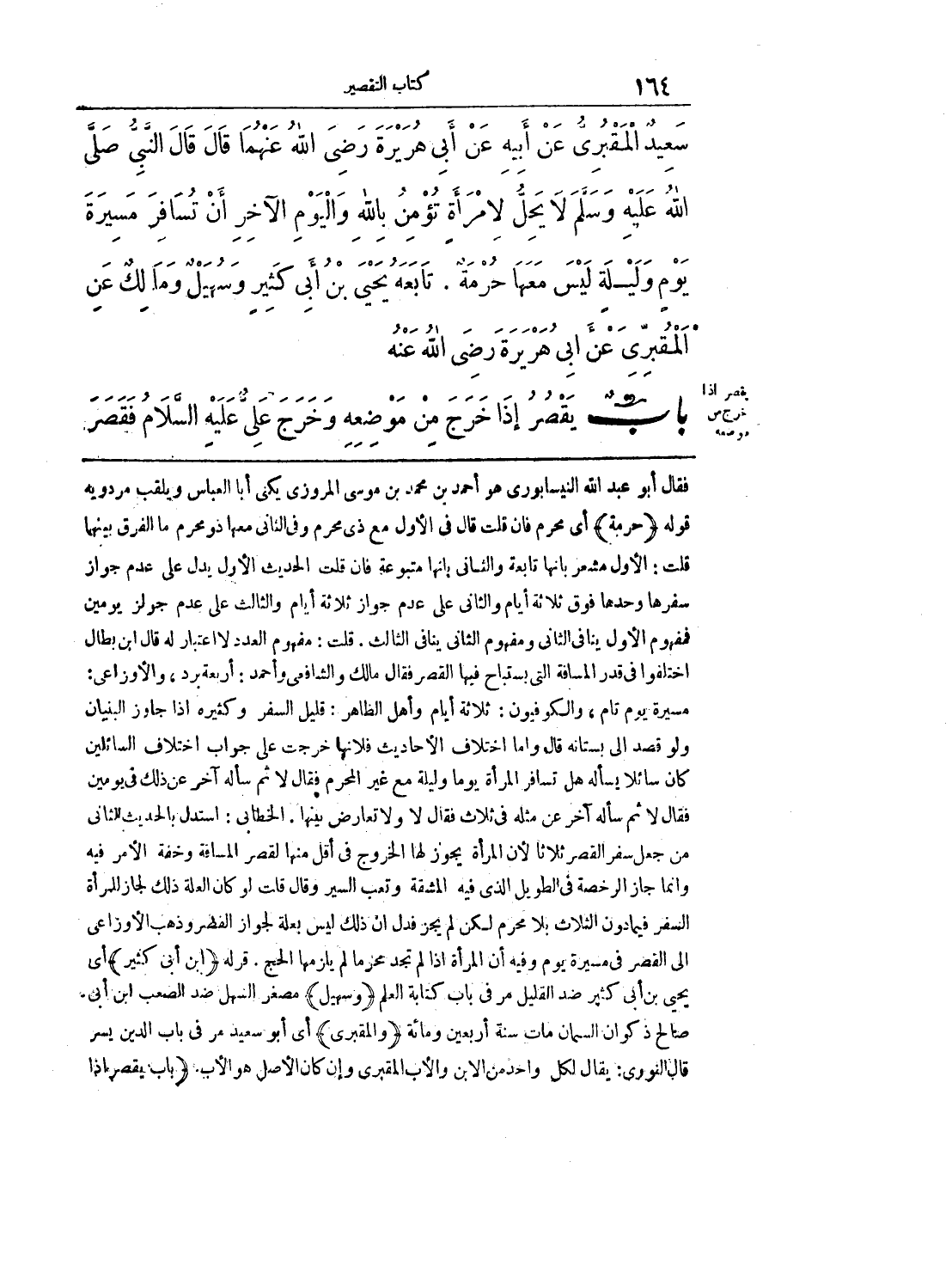 فيما دون الثلاث بلا محرم لكن لم يجز فدل أن ذلك ليس بعلة لجواز القصر وذهب الأوزاعي إلى القصر في مسيرة يوم وفيه أن المرأة إذا لم تجد محرما لم يلزمها الحج. قوله (ابن أبي كثير) أي يحيى بن أبي كثير ضد القليل مر في باب كتابة العلم (وسهيل) مصغر السهل ضد الصعب ابن أبي صالح ذكوان السمان مات سنة أربعين ومائة (والمقبري) أي أبو سعيد مر في باب الدين يسر قال النووي: يقال لكل واحد من الابن والأب المقبري وإن كان الأصل هو الأب. (باب يقصر إذا
