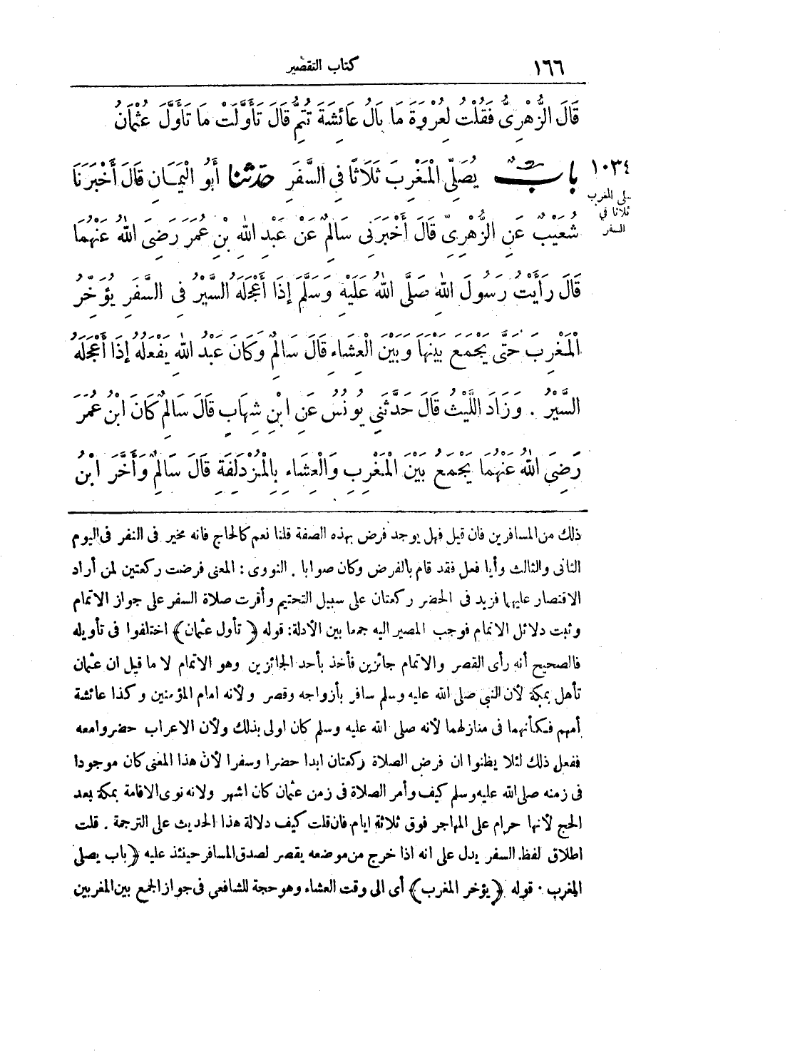 1034 - حدثنا أبو اليمان قال أخبرنا شعيب عن الزهري قال أخبرني سالم عن عبد الله بن عمر رضي الله عنهما قال رأيت رسول الله صلى الله عليه وسلم إذا أعجله السير في السفر يؤخر المغرب حتى يجمع بينها وبين العشاء قال سالم وكان عبد الله بن عمر رضي الله عنهما يفعله إذا أعجله السير. وزاد الليث قال حدثني يونس عن ابن شهاب قال سالم كان ابن عمر رضي الله عنهما يجمع بين المغرب والعشاء بالمزدلفة قال سالم وأخر ابن