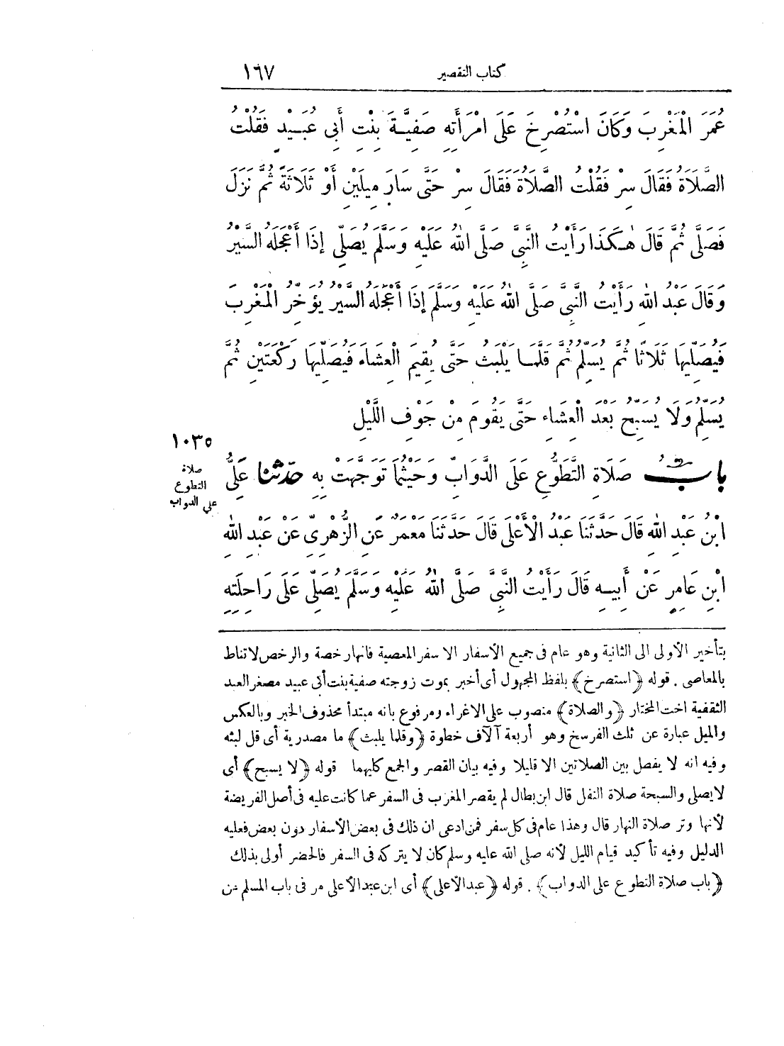 بتأخير الأولى والثانية وهو عام في جميع الأسفار إلا سفر المعصية فغنها رخصة والرخص لا تناط بالمعاصي. قوله (استصرخ) بلفظ المجهول أي أخبر بموت زوجته صفية بنت أبي عبيد مصغر العبد الثقفية أخت المختار (والصلاة) منصوب على الإغراء ومرفوع بأنه مبتدأ محذوف الخبر وبالعكس والميل عبارة عن ثلث الفرسخ وهو أربعة آلاف خطوة (وقلما يلبث) ما مصدرية أي قل لبثه وفيه انه لا يفصل بين الصلاتين إلا قليلا وفيه بيان القصر والجمع كليهما. قوله (لا يسبح) أي لا يصلي والسبحة صلاة النفل قال ابن بطال لم يقصر المغرب في السفر عما كانت عليه في أصل الفريضة لأنها وتر صلاة النهار قال وهذا عام في كل سفر فمن ادعى أن ذلك في بعض الأسفار دون بعض فعليه الدليل وفيه تأكيد قيام الليل لأنه صلى الله عليه وسلم كان لا يتركه في السفر فالحضر أولى بذلك (باب صلاة التطوع على الدواب). قوله (عبد الأعلى) أي ابن عبد الأعلى مر في باب المسلم من