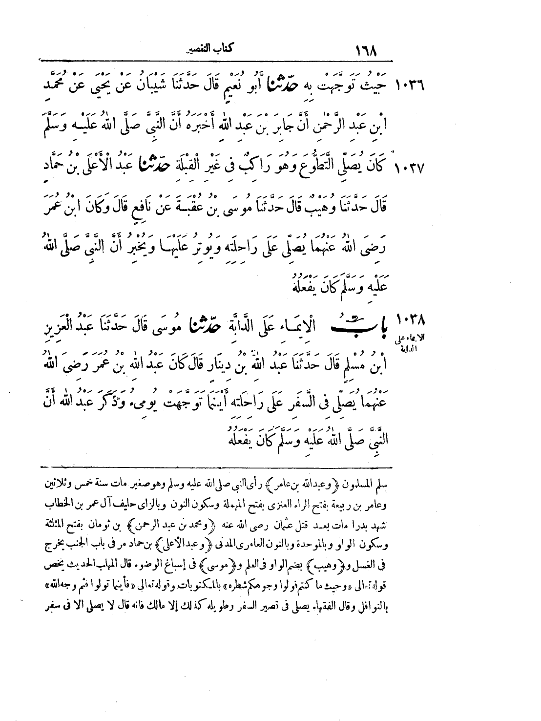 1038 - حدثنا موسى بن إسماعيل قال حدثنا عبد العزيز بن مسلم قال حدثنا عبد الله بن دينار قال كان عبد الله بن عمر رضي الله عنهما يصلي في السفر على راحلته أينما توجهت يومئ وذكر عبد الله أن النبي صلى الله عليه وسلم كان يفعله.