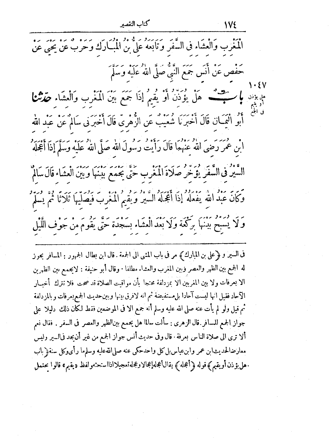 المغرب والعشاء في السفر وتابعه علي بن المبارك وحرب عن يحيى عن حفص عن أنس جمع النبي صلى الله عليه وسلم.