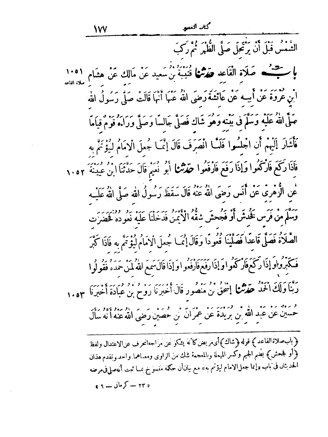 1051 - حدثنا قتيبة بن سعيد عن مالك عن هشام بن عروة عن أبيه عن عائشة رضي الله عنها أنها قالت صلى رسول الله صلى الله عليه وسلم في بيته وهو شاك فصلى جالسا وصلى وراءه قوم قياما فأشار إليهم أن اجلسوا فلما انصرف قال إنما جعل الإمام ليؤتم به فإذا ركع فاركعوا وإذا رفع فارفعوا