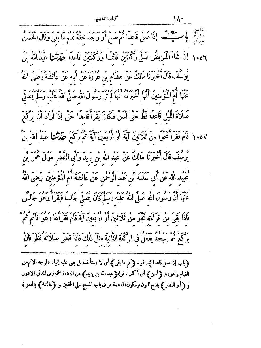 1056 - حدثنا عبد الله بن يوسف قال أخبرنا مالك عن هشام بن عروة عن أبيه عن عائشة رضي الله عنها أم المؤمنين أنها أخبرته أنها لم تر رسول الله صلى الله عليه وسلم يصلي صلاة الليل قاعدا قط حتى أسن فكان يقرأ قاعدا حتى إذا أراد أن يركع قام فقرأ نحوا من ثلاثين آية أو أربعين
