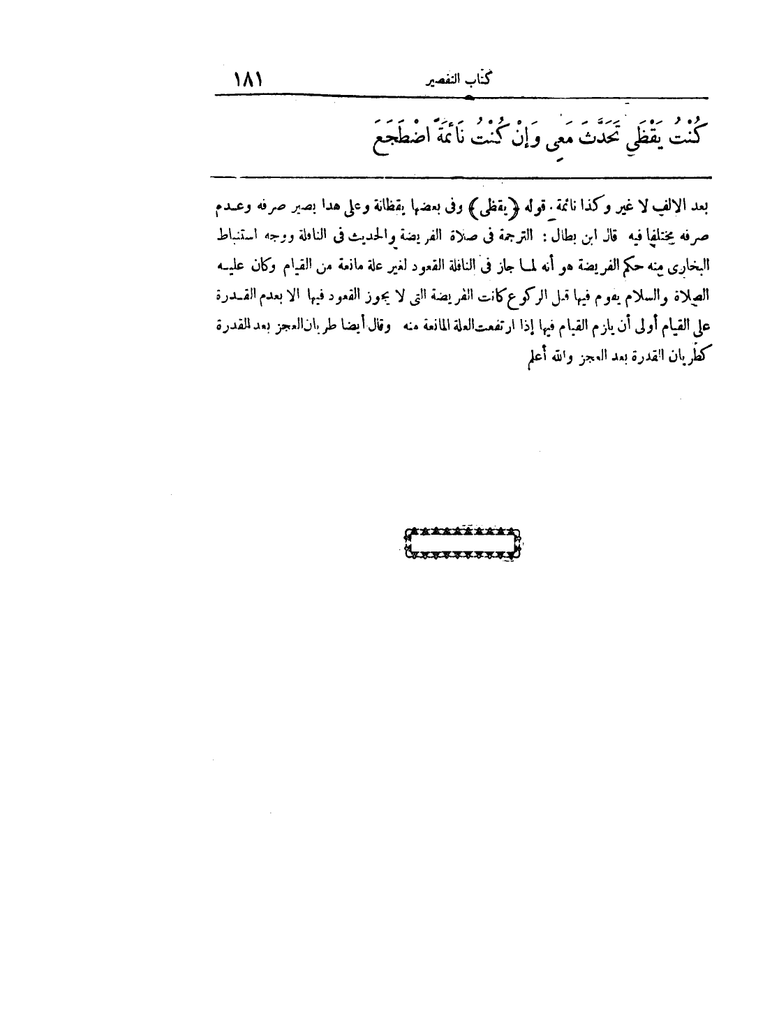 بعد الألف لا غير وكذا نائمة. قوله (يقظى) وفي بعضها يقظانة وعلى هذا يصير صرفه وعدم صرفه يختلفا فيه. قال ابن بطال: الترجمة في صلاة الفريضة والحديث في النافلة ووجه استنباط البخاري منه حكم الفريضة هو أنه لما جاز في النافلة القعود لغير علة مانعة من القيام وكان عليه الصلاة والسلام يقوم فيها قبل الركوع كانت الفريضة التي لا يجوز القعود فيها إلا بعدم القدرة على القيام أولى أن يلزم القيام فيها إذا ارتفعت العلة المانعة منه وقال أيضا طريان العجز بغد المقدرة كطريان القدرة بعد العجز والله أعلم.