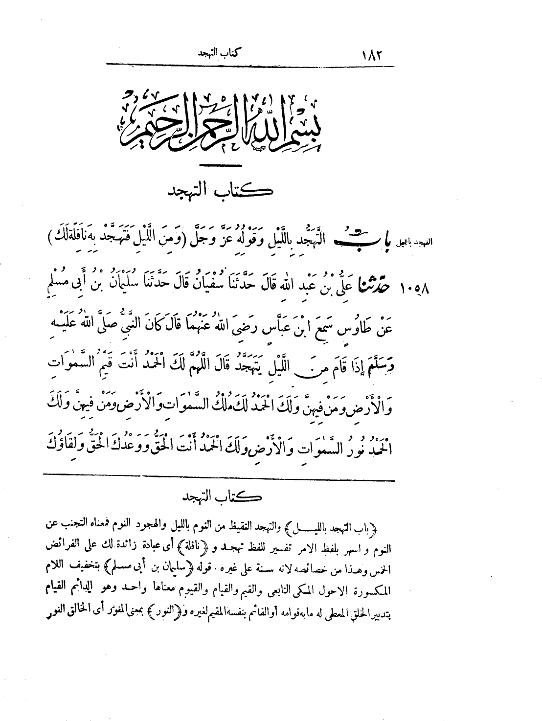 1058 - حدثنا علي بن عبد الله قال حدثنا سفيان قال حدثنا سليمان بن أبي مسلم عن طاوس سمع ابن عباس رضي الله عنهما قال كان النبي صلى الله عليه وسلم إذا قام من الليل يتهجد قال اللهم لك الحمد أنت قيم السموات والأرض ومن فيهن ولك الحمد لك ملك السموات والأرض ومن فيهن ولك الحمد أنت نور السموات والأرض ومن فيهن ولك الحمد أنت ملك السموات والأرض ولك الحمد أنت الحق ووعدك الحق ولقاؤك
