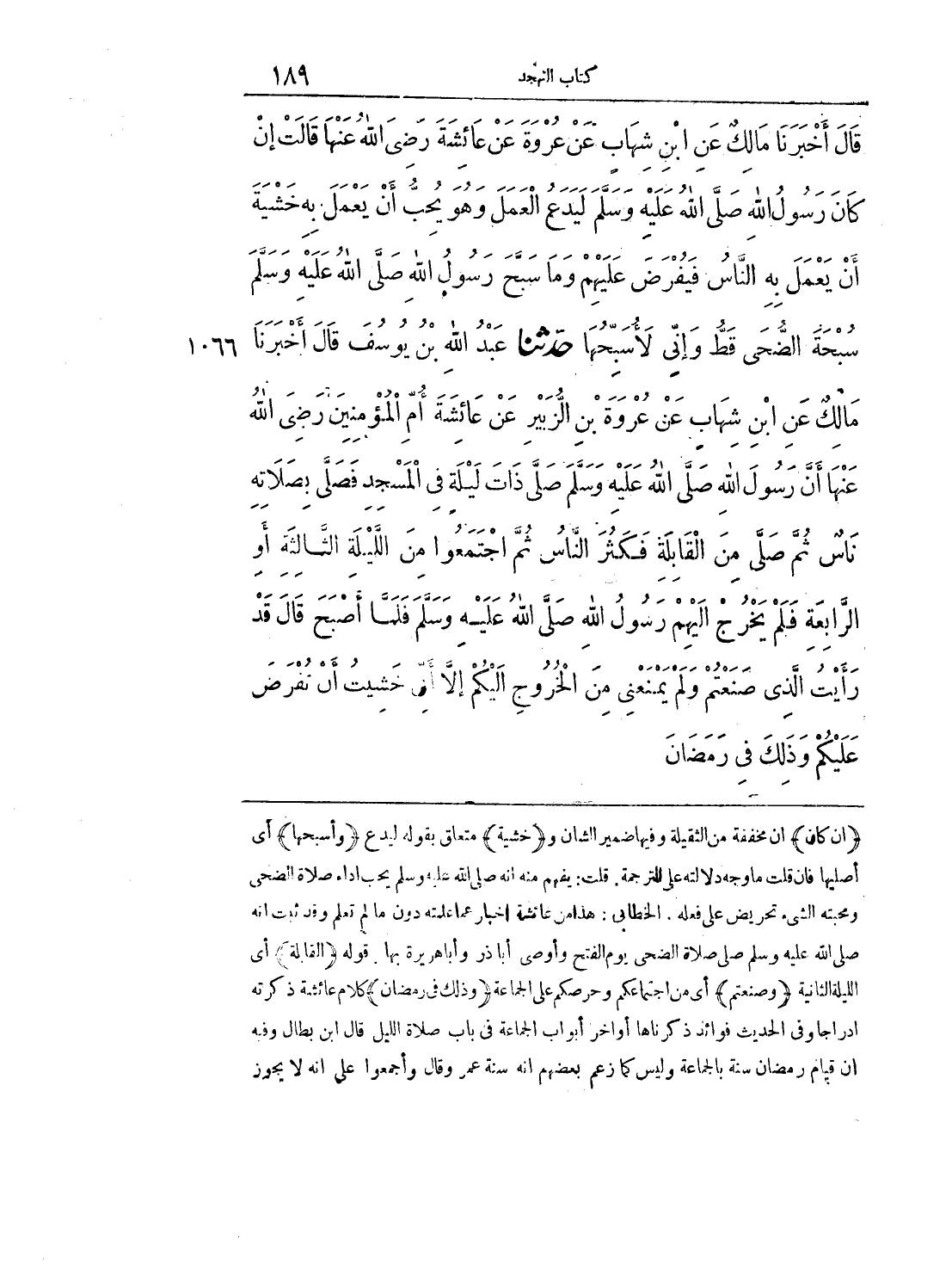 1066 - حَدَّثَنَا عَبْدُ اللَّهِ بْنُ يُوسُفَ قَالَ أَخْبَرَنَا مَالِكٌ عَنْ ابْنِ شِهَابٍ عَنْ عُرْوَةَ بْنِ الزُّبَيْرِ عَنْ عَائِشَةَ أُمِّ الْمُؤْمِنِينَ رَضِيَ اللَّهُ عَنْهَا أَنَّ رَسُولَ اللَّهِ صَلَّى اللَّهُ عَلَيْهِ وَسَلَّمَ صَلَّى ذَاتَ لَيْلَةٍ فِي الْمَسْجِدِ فَصَلَّى بِصَلَاتِهِ نَاسٌ ثُمَّ صَلَّى مِنْ الْقَابِلَةِ فَكَثُرَ النَّاسُ ثُمَّ اجْتَمَعُوا مِنْ اللَّيْلَةِ الثَّالِثَةِ أَوْ الرَّابِعَةِ فَلَمْ يَخْرُجْ إِلَيْهِمْ رَسُولُ اللَّهِ صَلَّى اللَّهُ عَلَيْهِ وَسَلَّمَ فَلَمَّا أَصْبَحَ قَالَ قَدْ رَأَيْتُ الَّذِي صَنَعْتُمْ وَلَمْ يَمْنَعْنِي مِنْ الْخُرُوجِ إِلَيْكُمْ إِلَّا أَنِّي خَشِيتُ أَنْ تُفْرَضَ عَلَيْكُمْ وَذَلِكَ فِي رَمَضَانَ
