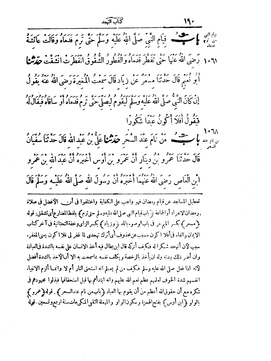 تعطيل المساجد عن قيام رمضان فهو واجب على الكفاية واختلفوا في أن الأفضل في صلاة رمضان الانفراد أو الجماعة (باب قيام النبي صلى الله عليه وسلم حتى ترم) بلفظ المضارع أي تشقق: قوله (مسعر) بكسر الميم مر في باب الوضوء بالمد (وزياد) بكسر الزاي وخفة التحتانية في آخر كتاب الإيمان والفاء في أفلا أكون مسبب عن محذوف أي أترك تهجدي لما غفر لي فلا أكون يعني المغفرة سبب لأن أتهجد شكرا له فكيف أتركه قال ابن بطال: فيه أخذ الإنسان على نفسه بالشدة في العبادة وإن أضر ذلك ببدنه وله أن يأخذ بالرخصة ويكلف نفسه بما سمحت به إلا أن الأخذ بالشدة أفضل لأنه إذا فعل صلى الله عليه وسلم فكيف من لم يعلم أنه استحق النار أم لا وإنما ألزم الأنبياء أنفسهم شدة الخوف لعلمهم عظم نعم الله عليهم وأنه ابتدأهم بها قبل استحقاقها فبذلوا مجهودهم في شكره مع أن حقوق الله أعظم من أن يقوم بها العباد (باب من نام عند السحر). قوله (عمرو) بالواو (ابن أوس) بفتح الهمزة وسكون الواو والمهملة الثقفي المكي مات سنة أربع وتسعين. قوله