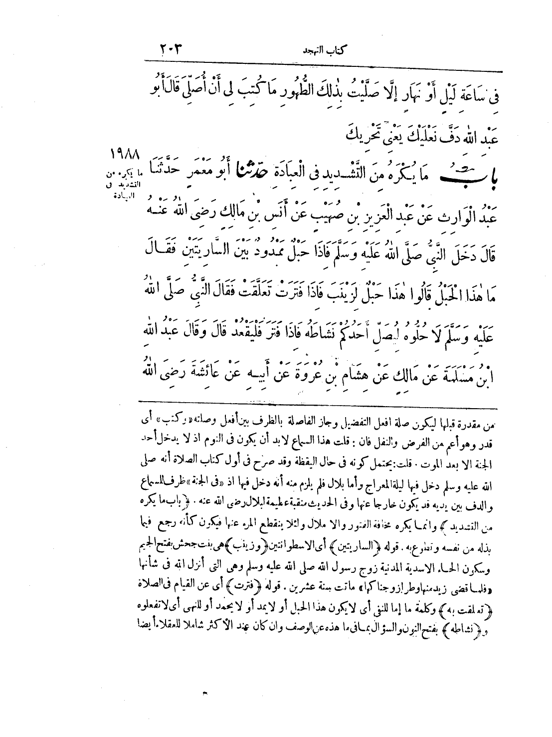 من مقدرة قبلها ليكون صلة أفعل التفضيل وجاز الفاصلة بالظرف بين أفعل وصلته "وكتب" أي قدر وهو أعم من الفرض والنفل فإن قلت هذا السماع لا بد أن يكون في النوم إذ لا يدخل أحد الجنة بعد الموت. قلت: يحتمل كونه في حال اليقظة وقد صرح في أول كتاب الصلاة أنه صلى الله عليه وسلم دخل فيها ليلة المعراج وأما بلال فلم يلزم منه أنه دخل فيها إذ "في الجنة" ظرف للسماع والدف بين يديه قد يكون خارجا عنها وفي الحديث منقبة عظيمة لبلال رضي الله عنه. (باب ما يكره من التشديد) وإنما يكره مخافة الفتور وإلا ملال ولئلا ينقطع المرء عنها فيكون كأنه رجع فيما بذله من نفسه وتطوع به. قوله (الساريتين) أي الاسطوانتين (وزينب) هي بنت جحش بفتح الجيم وسكون الحاء الأسدية المدنية زوج رسول الله صلى الله عليه وسلم وهي التي أنزل الله في شأنها «قلما قضى زيد منها وطراً زوجناكها» ماتت سنة عشرين. قوله (فترت) أي عن القيام في الصلاة (تعلقت به) وكلمة ما إما للنفي أي لا يكون هذا الحبل أو لا يمد أو لا يحمد أو للنهي أي لا تفعلوه و (نشاطه) بفتح النون والسؤال بما في ما هذه عن الوصف وإن كان عند الأكثر شاملاً للعقلاء أيضاً
