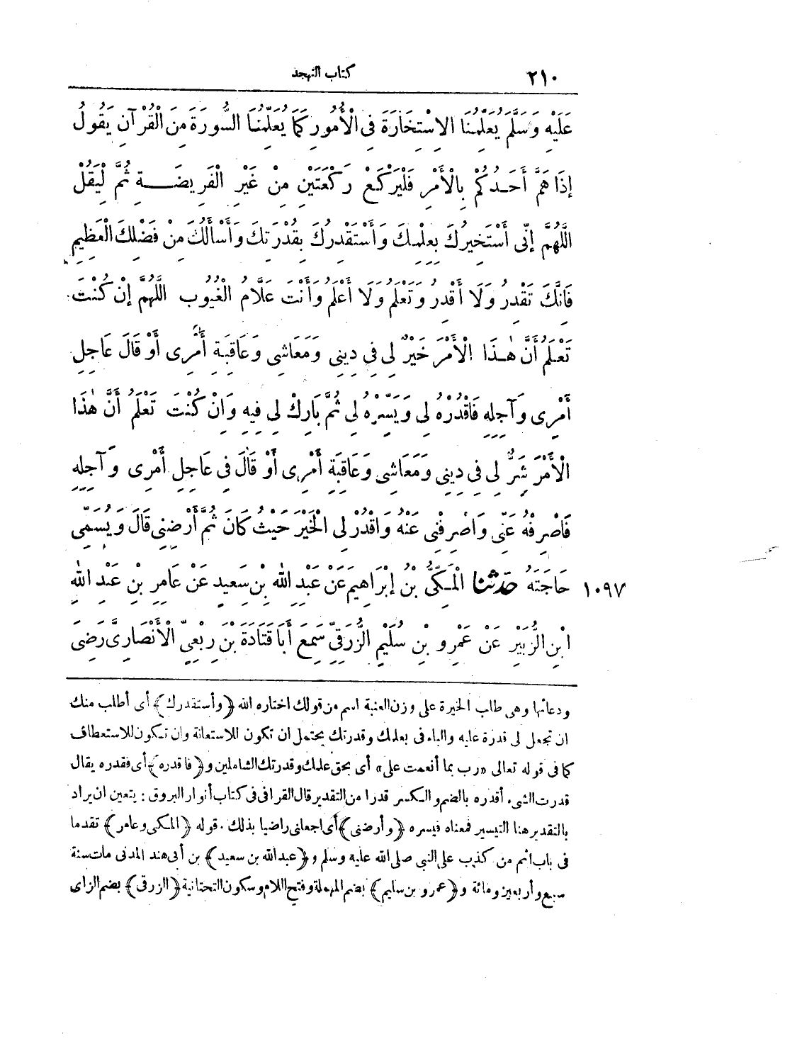 ودعائها وهي طلب الخيرة على وزن العنبة اسم من قولك اختاره الله (وأستقدرك) أي أطلب منك أن تجعل لي قدرة عليه والباء في بعلمك وقدرتك يحتمل أن تكون للاستعانة وان تكون للاستعطاف كما في قوله تعالى «رب بما أنعمت علي» أي بحق علمك وقدرتك الشاملين و (فاقدره) أي فقدره يقال قدرت الشيء أقدره بالضم والكسر قدرا من التقدير قال القرافي في كتاب أنوار البروق: يتعين أن يراد بالتقدير هنا التيسير فمعناه فيسره (وأرضني) أي اجعلني راضيا بذلك. قوله (المكي وعامر) تقدما في باب إثم من كذب على النبي صلى الله عليه وسلم و (عبد الله بن سعيد) بن أبي هند المدني مات سنة سبع وأربعين ومائة و (عمرو بن سليم) بضم المهملة وفتح اللام وسكون التحتانية (الزرقي) بضم الزاي