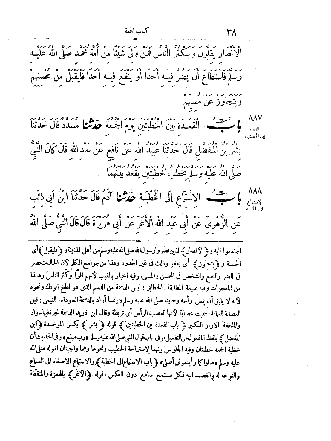 اجتمعوا إليه و {الأنصار} الذين نصروا رسول الله صلى الله عليه وسلم من أهل المدينة و {فليقبل} أي الحسنة و {يتجاوز} أي يعفو وذلك في غير الحدود وهذا من جوامع الكلم لأن الحال منحصر في الضر والنفع والشخص في المحسن والمسيء وفيه إخبار بالغيب لأنهم قلوا وكثر الناس وهذا من المعجزات وفيه صيغة المطابقة، الخطابي: ليس الدسمة من الدسم الذي هو لطخ الودك ونحوه لأنه لا يليق أن يمس رأسه وجبينه صلى الله عليه وسلم وإنما أراد بالدسمة السوداء، التيمي: قيل العصابة العمامة سميت عصابة لأنها تعصب الرأس أي تربطه وقال ابن دريد الدسمة غبرة فيها سواد والملحقة الازار الكبير {باب القعدة بين الخطبتين} قوله {بشر} بكسر الموحدة {ابن المفضل} بلفظ المفعول من التفعيل مر في باب قول النبي صلى الله عليه وسلم "رب مبلغ" وفي الحدجيث أن خطبة الجمعة خطبتان وفيه الجلوس بينهما لاستراحة الخطيب ونحوها وهما واجبتان لقوله صلى الله عليه وسلم "صلوا كما رأيتموني أصلي" {باب الاستماع إلى الخطبة} والاستماع الاصغاء إلى السماع والتوجه له والقصد إليه فكل مستمع سامع دون العكس، قوله {الأغر} بالهمزة والمنقطة