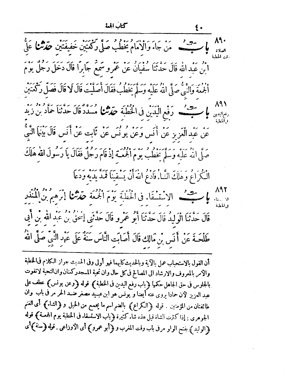 أن القول بالاستحباب عمل بالآية وبالحديث كليهما فهو أولى وفي الحديث جواز الكلام في الخطبة والأمر بالمعروف والإرشاد إلى المصالح في كل حال وأن تحية المسجد ركعتان وأن التحية لا تفوت بالجلوس في حق الجاهل حكمها {باب رفع اليدين في الخطبة} قوله {وعن يونس} عطف على عبد العزيز لأن حمادا يروي عنه أيضا ويونس هو ابن عبيد مصغر ضد الحر مر في باب وإن طائفتان من المؤمنين. قوله {الكراع} بالضم اسم ما يجمع من الخيل و {الشاء} أي الغنم الجوهري: إذا كثرت الشاة قيل هذه شاء كثيرة {باب الاستسقاء في الخطبة يوم الجمعة} قوله {الوليد} بفتح الواو مر في باب وقت المغرب و {أبو عمرو} أي الأوزاعي. قوله {سنة} أي
