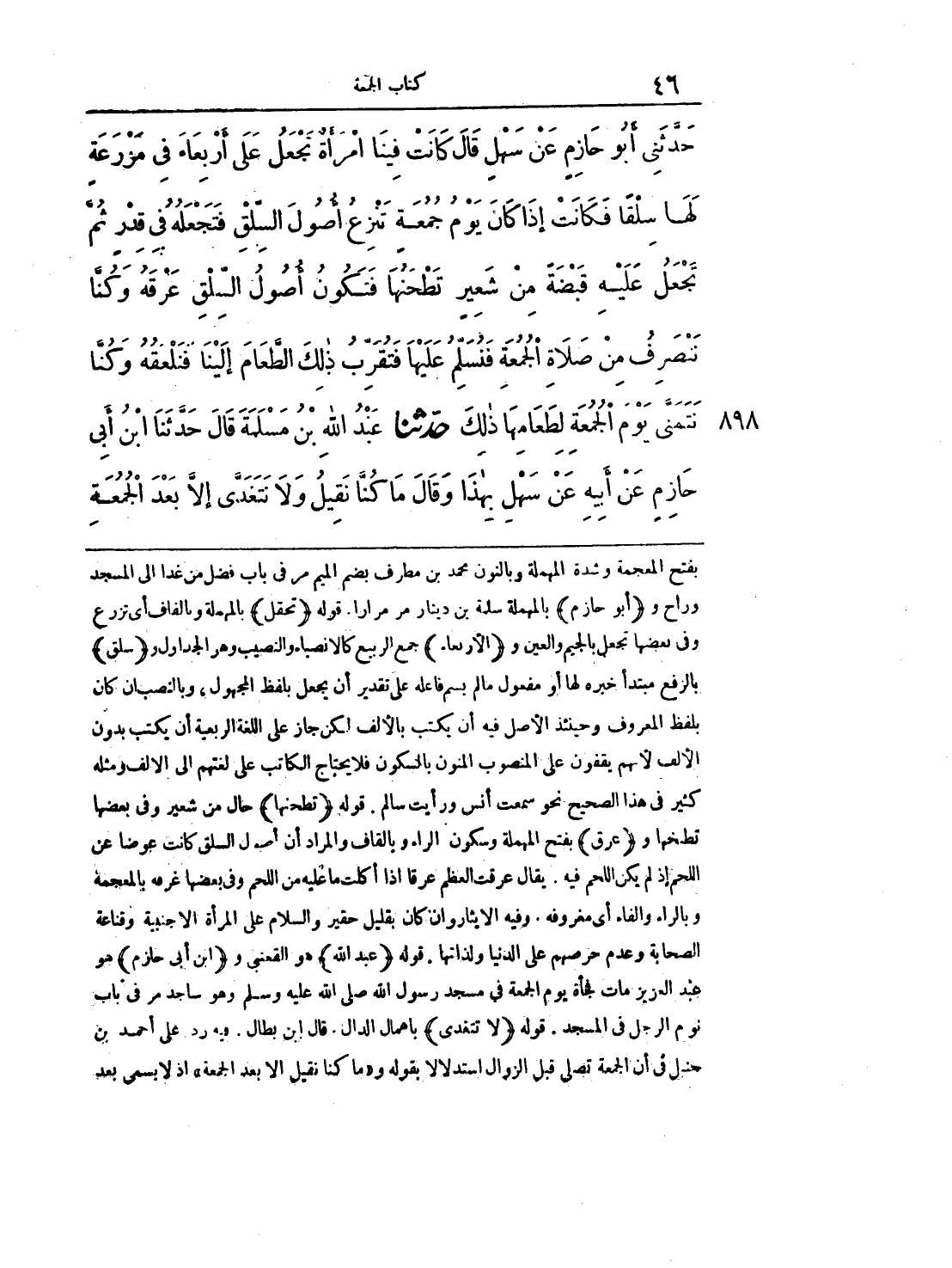 حَدَّثَنِي أَبُو حَازِمٍ عَنْ سَهْلٍ قَالَ كَانَتْ فِينَا امْرَأَةٌ تَجْعَلُ عَلَى أَرْبِعَاءَ فِي مَزْرَعَةٍ لَهَا سِلْقًا فَكَانَتْ إِذَا كَانَ يَوْمُ جُمُعَةٍ تَنْزِعُ أُصُولَ السِّلْقِ فَتَجْعَلُهُ فِي قِدْرٍ ثُمَّ تَجْعَلُ عَلَيْهِ قَبْضَةً مِنْ شَعِيرٍ تَطْحَنُهَا فَتَكُونُ أُصُولُ السِّلْقِ عَرْقَهُ وَكُنَّا نَنْصَرِفُ مِنْ صَلَاةِ الْجُمُعَةِ فَنُسَلِّمُ عَلَيْهَا فَتُقَرِّبُ ذَلِكَ الطَّعَامَ إِلَيْنَا فَنَلْعَقُهُ وَكُنَّا نَتَمَنَّى يَوْمَ الْجُمُعَةِ لِطَعَامِهَا ذَلِكَ