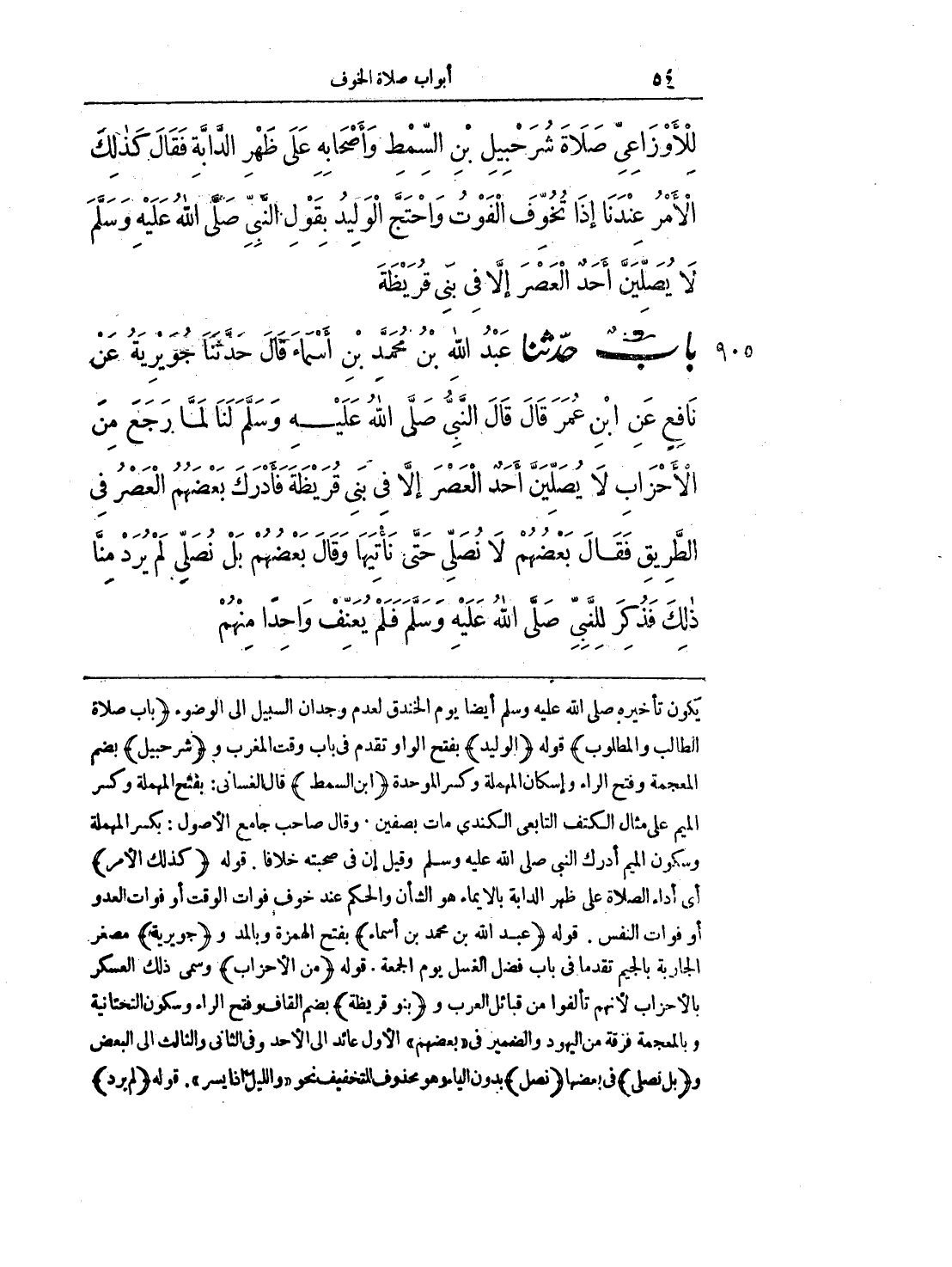 يكون تأخيره صلى الله عليه وسلم أيضا يوم خندق لعدم وجدان السبيل إلى الوضوء ((باب صلاة الطالب والمطلوب)) قوله ((الوليد)) بفتح الواو تقدم في باب وقت المغرب و ((شرحبيل)) بضم المعجمة وفتح الراء وإسكان المهملة وكسر الموحدة ((ابن سمط)) قال الغساني: بفتح المهملة وكسر الميم على مثال الكتف التابعي الكندي مات بصفين, وقال صاحب جامع الأصول: بكسر المهملة وسكون الميم أدرك النبي صلى الله عليه وسلم وقيل إن في صحبته خلافا, قوله ((كذلك الأمر)) أي أداء الصلاة على ظهر الدابة بالإيماء هو الشأن والحكم عند خوف فوات الوقت أو فوات العدو أو فوات النفس, قوله ((عبد الله بن محمد بن أسماء)) بفتح الهمزة وبالمد و ((جويرية)) مصغر الجارية بالجيم تقدما في باب فضل الغسل يوم الجمعة, قوله ((من الأحزاب)) وسمي ذلك العسكر بالأحزاب لأنهم تألفوا من قبائل العرب و ((بنو قريظة)) بضم القاف وفتح الراء وسكون التحتانية وبالمعجمة فرقة من اليهود والضمير في «بعضهم» الأول عائد إلى الأحد وفي الثاني والثالث إلى البعض و ((بل نصلي)) في بعضها ((نصل)) بدون الياء وهو محذوف للتخفيف نحو «والليل إذا يسر» , قوله ((لم يرد))