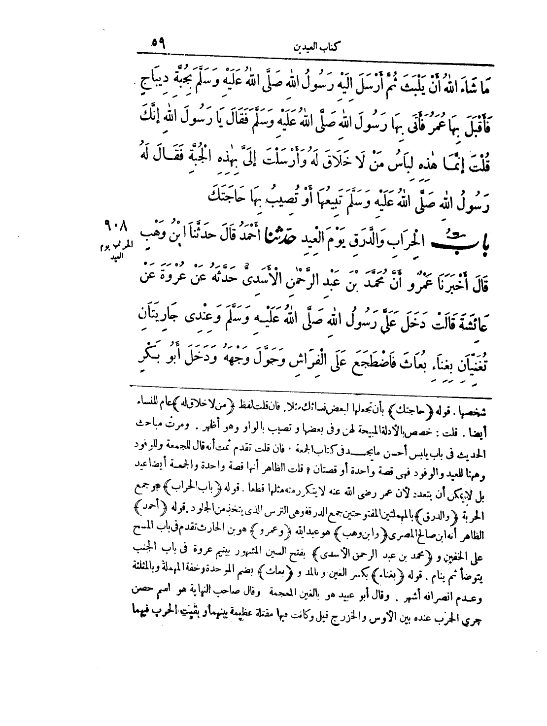 شخصها, قوله ((حاجتك)) بأن تجعلها لبعض نسائك مثلا, فإن قلت لفظ ((من لا خلاق له)) عام للنساء أيضا, قلت: خصص بالأدلة المبيحة لهن وفي بعضها وتصيب بالواو وهو أظهر, ومرت مباحث الحديث في باب يلبس أحسن ما يجد في كتاب الجمعة, فإن قلت تقدم ثمت أنه قال للجمعة وللوفود وههنا للعيد والوفود فهي قصة واحدة أو قصتان؟ قلت الظاهر أنها قصة واحدة والجمعة أيضا عيد بل لا يمكن أن يتعدد لأن عمر رضي الله عنه لا يتكرر منه مثلها قطعا, قوله ((باب الحراب)) هو جمع الحربة ((والدرق)) بالمهملتين المفتوحتين جمع الدرقة وهي الترس الذي يتخذ من الجلود, قوله ((أحمد)) الظاهر أنه ابن صالح المصري ((وابن وهب)) هو عبد الله ((وعمرو)) هو بن الحارث تقدم في باب المسح على الخفين و ((محمد بن عبد الرحمن الأسدي)) بفتح السين المشهور بيتيم عروة في باب الجنب يتوضأ ثم ينام, قوله ((بغناء)) بكسر الغين وبالمد و ((بعاث)) بضم الموحدة وخفة المهملة وبالمثلثة وعدم انصرافه أشهر, وقال أبو عبيد هو بالغين المعجمة وقال صاحب النهاية هو اسم حصن جرى الحرب عنده بين الأوس والخزرج قيل وكانت فيها مقتلة عظيمة بينهما وبقيت الحرب فيهما