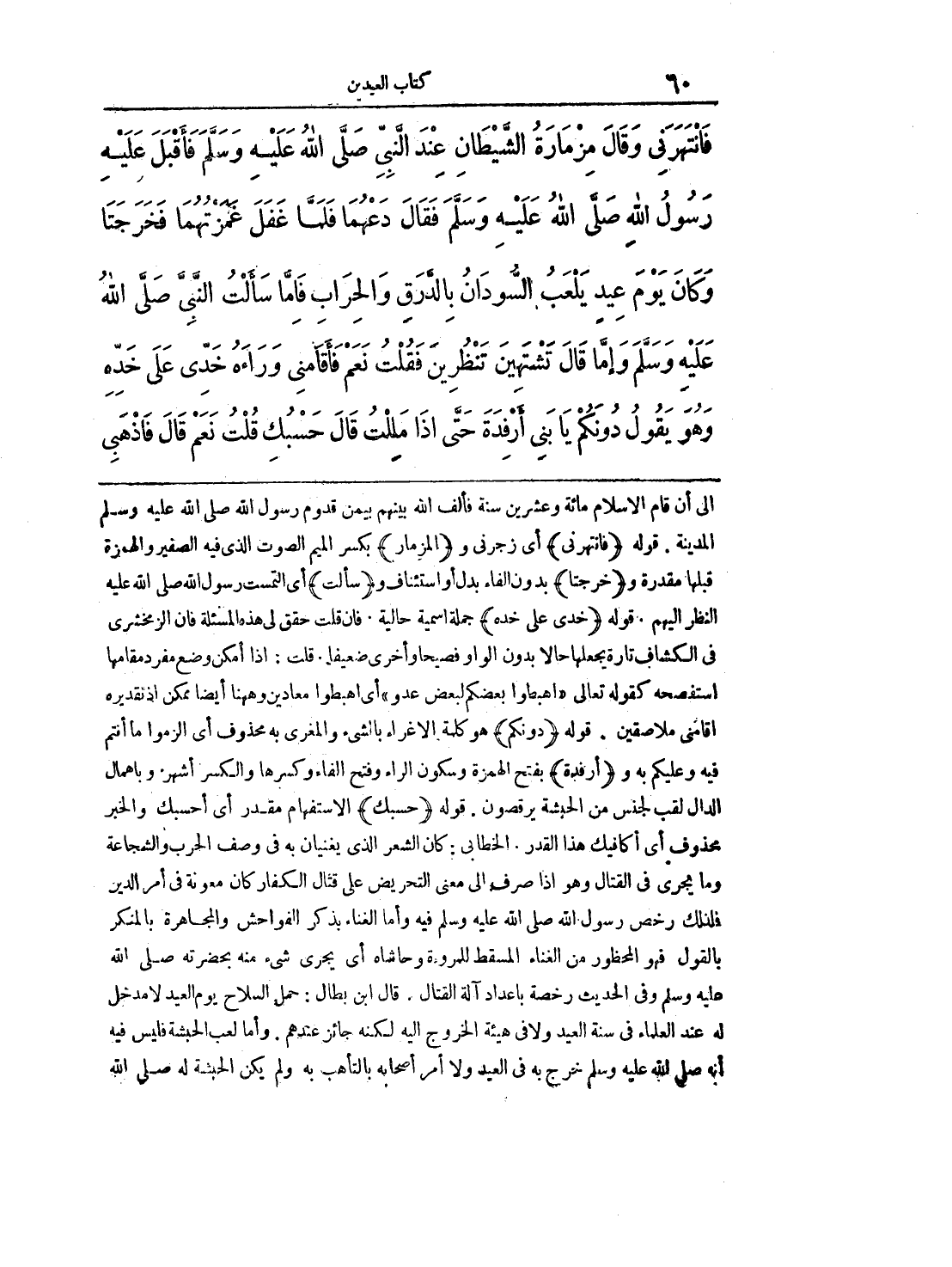 فَانْتَهَرَنِي وَقَالَ مِزْمَارَةُ الشَّيْطَانِ عِنْدَ النَّبِيِّ صَلَّى اللَّهُ عَلَيْهِ وَسَلَّمَ فَأَقْبَلَ عَلَيْهِ رَسُولُ اللَّهِ عَلَيْهِ السَّلَام فَقَالَ دَعْهُمَا فَلَمَّا غَفَلَ غَمَزْتُهُمَا فَخَرَجَتَا، وَكَانَ يَوْمَ عِيدٍ يَلْعَبُ السُّودَانُ بِالدَّرَقِ وَالْحِرَابِ فَإِمَّا سَأَلْتُ النَّبِيَّ صَلَّى اللَّهُ عَلَيْهِ وَسَلَّمَ وَإِمَّا قَالَ تَشْتَهِينَ تَنْظُرِينَ فَقُلْتُ نَعَمْ فَأَقَامَنِي وَرَاءَهُ خَدِّي عَلَى خَدِّهِ وَهُوَ يَقُولُ دُونَكُمْ يَا بَنِي أَرْفِدَةَ حَتَّى إِذَا مَلِلْتُ قَالَ حَسْبُكِ قُلْتُ نَعَمْ قَالَ فَاذْهَبِي