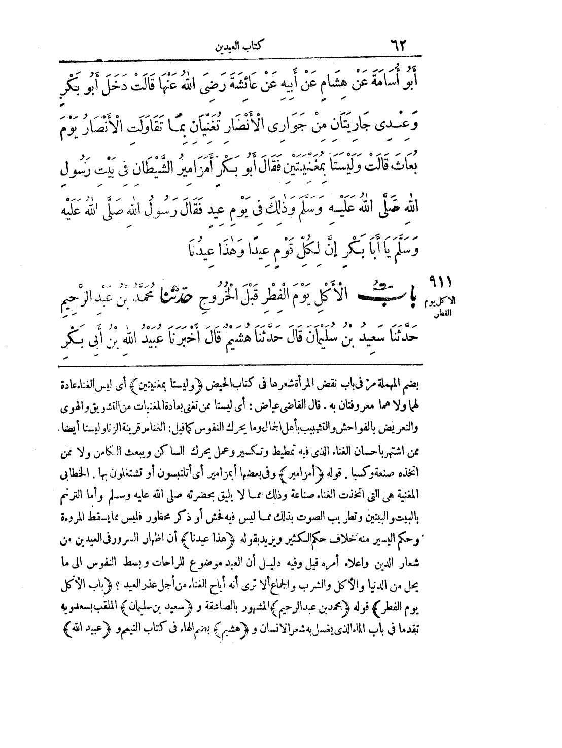 بضم المهملة مر في باب نقض المرأة شعرها في كتاب الحيض ((وليستا بمغنيتين)) أي ليس الغناء عادة لهما ولا هما معروفتان به, قال القاضي عياض: أي ليستا ممن تغني بعادة المغنيات من التشويق والهوى والتعريض بالفواحش والتشبيب بأهل الجمال وما يحرك النفوس كما قيل: الغناء وقرينة الزنا وليستا أيضا, ممن اشتهر بإحسان الغناء الذي فيه تمطيط وتكسير وعمل يحرك الساكن ويبعث الكامن ولا ممن اتخذه صنعة وكسبا, قوله ((أمزامير)) وفي بعضها أبمزامير أي أتلتبسون أو تشتغلون بها, الخطابي: المغنية هي التي اتخذت الغناء صناعة وذلك مما لا يليق بحضرته صلى الله عليه وسلم وأما الترنم بالبيت والبيتين وتطريب الصوت بذلك مما ليس فيه فحش أو ذكر محظور فليس مما يسقط المروءة وحكم اليسير منه خلاف حكم الكثير ويريد بقوله ((هذا عيدنا)) أن إظهار السرور في العيدين من شعار الدين وإعلاء أمره قيل وفيه دليل أن العيد موضوع للراحات وبسط النفوس إلى ما يحل من الدنيا والأكل والشرب والجماع ألا ترى أنه أباح الغناء من أجل عذر العيد؟ ((باب الأكل يوم الفطر)) قوله ((محمد بن عبد الرحيم)) المشهور بالصاعقة و ((سعيد بن سليمان)) الملقب بسعدويه تقدما في باب الماء الذي يغسل به شعر الإنسان و ((هشيم)) بضم الهاء في كتاب التيمم و ((عبيد الله))