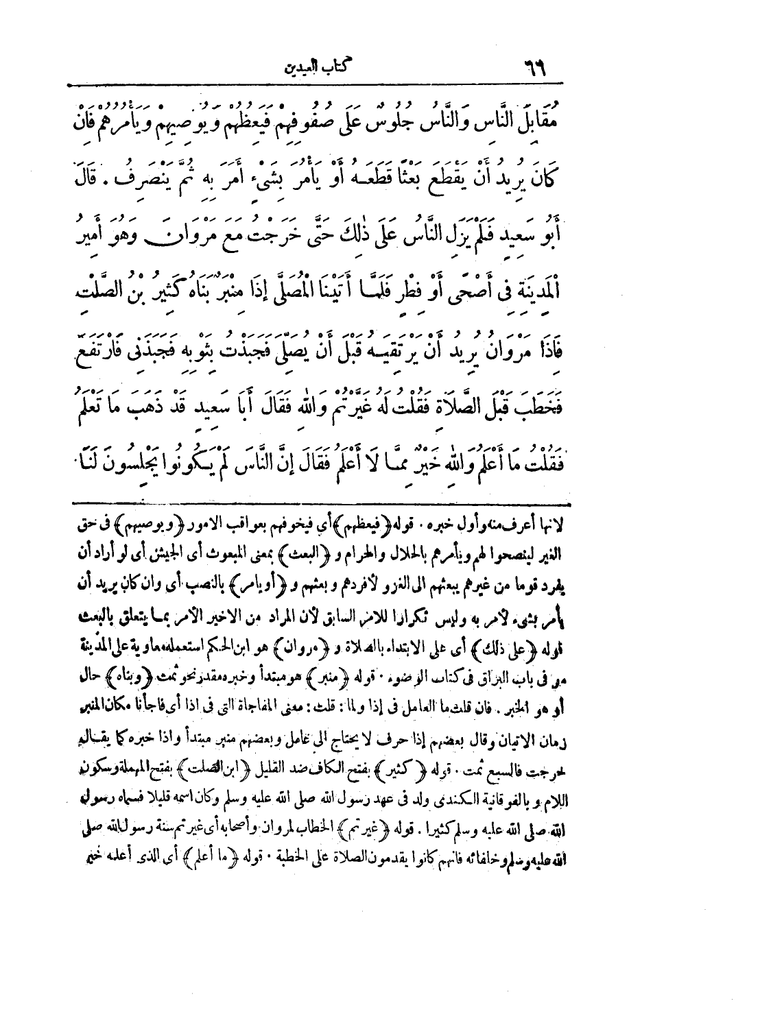 مُقَابِلَ النَّاسِ وَالنَّاسُ جُلُوسٌ عَلَى صُفُوفِهِمْ فَيَعِظُهُمْ وَيُوصِيهِمْ وَيَامُرُهُمْ فَإِنْ كَانَ يُرِيدُ أَنْ يَقْطَعَ بَعْثًا قَطَعَهُ أَوْ يَامُرَ بِشَيْءٍ أَمَرَ بِهِ ثُمَّ يَنْصَرِفُ. قَالَ أَبُو سَعِيدٍ فَلَمْ يَزَلْ النَّاسُ عَلَى ذَلِكَ حَتَّى خَرَجْتُ مَعَ مَرْوَانَ وَهُوَ أَمِيرُ الْمَدِينَةِ فِي أَضْحًى أَوْ فِطْرٍ فَلَمَّا أَتَيْنَا الْمُصَلَّى إِذَا مِنْبَرٌ بَنَاهُ كَثِيرُ بْنُ الصَّلْتِ فَإِذَا مَرْوَانُ يُرِيدُ أَنْ يَرْتَقِيَهُ قَبْلَ أَنْ يُصَلِّيَ فَجَبَذْتُ بِثَوْبِهِ فَجَبَذَنِي فَارْتَفَعَ فَخَطَبَ قَبْلَ الصَّلَاةِ فَقُلْتُ لَهُ غَيَّرْتُمْ وَاللَّهِ فَقَالَ أَبَا سَعِيدٍ قَدْ ذَهَبَ مَا تَعْلَمُ فَقُلْتُ مَا أَعْلَمُ وَاللَّهِ خَيْرٌ مِمَّا لَا أَعْلَمُ فَقَالَ إِنَّ النَّاسَ لَمْ يَكُونُوا يَجْلِسُونَ لَنَا