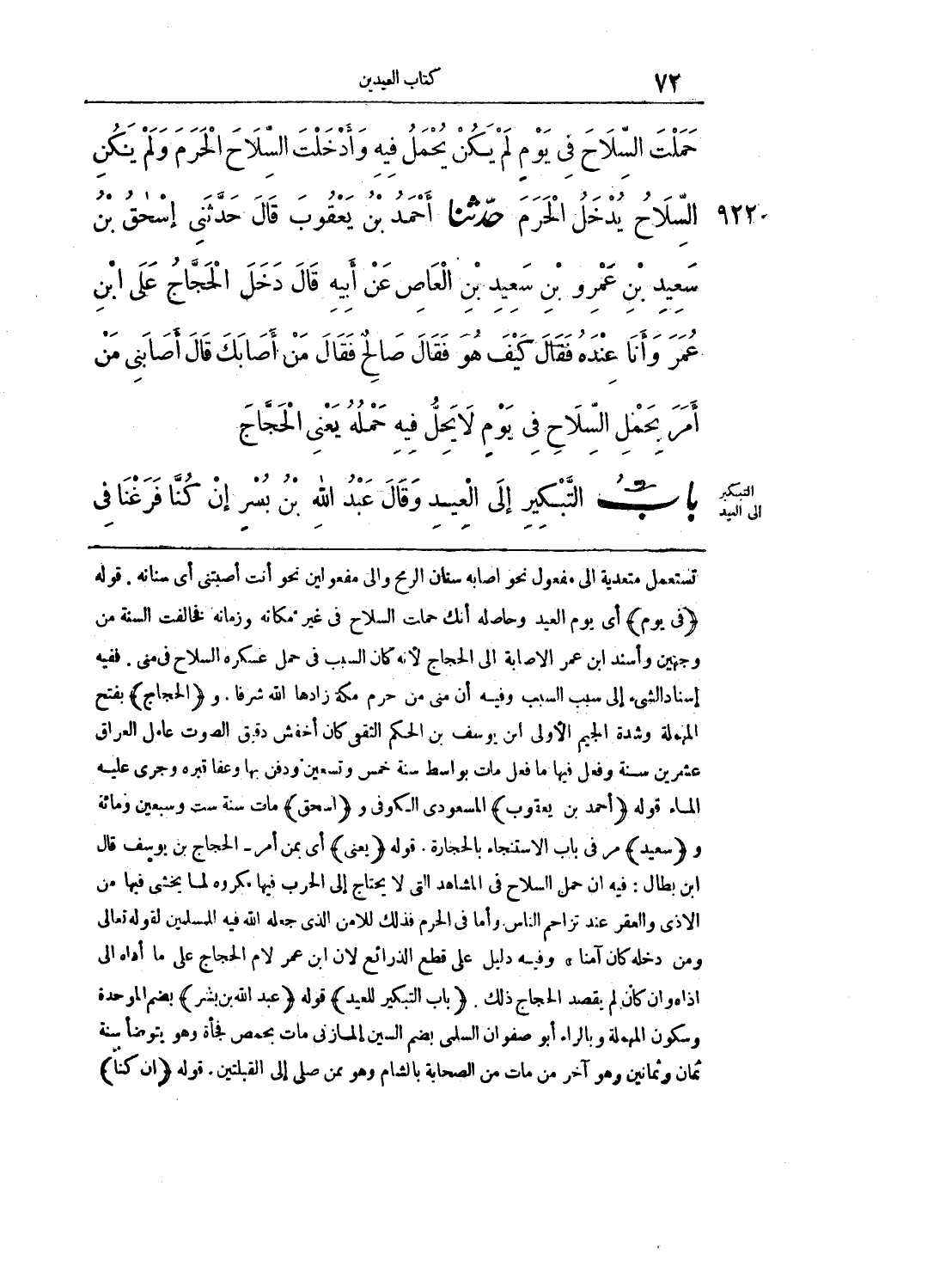 تستعمل متعدية إلى مفعول نحو إصابة سنان الرمح وإلى مفعولين نحو أنت أصبتني أي سنانه, قوله ((في يوم)) أي العيد وحاصلة أنك حملت السلاح في غير مكانه وزمانه فحالفت السنة من وجهتين وأسند ابن عمر الإصابة إلى الحجاج لأنه كان السبب في حمل عسكره السلاح في منى, ففيه إسناد الشيء إلى سبب السبب وفيه أن منى من حرم مكة زادها الله شرفا, و ((الحجاج)) بفتح المهملة وشدة الجيم الأولى ابن يوسف بن الحكم الثقفي كان أخفش دقيق الصوت عامل العراق عشرين سنة وفعل فيها ما فعل مات بواسط سنة خمس وتسعين ودفن بها وعفا قبره وجرى عليه الماء قوله ((أحمد بن يعقوب)) المسعودي الكوفي و ((إسحق)) مات سنة ست وسبعين ومائة و ((سعيد)) مر في باب الاستنجاء بالحجارة, قوله ((يعني)) أي بمن أمر_ الحجاج بن يوسف قال ابن بطال: فيه أن حمل السلاح في المشاهد التي لا يحتاج إلى الحرب فيها مكروه لما يخشى فيها من الأذى والعقر عند تزاحم الناس, وأما في الحرم فذلك للأمن الذي جعله الله فيه المسلمين لقوله تعالى «ومن دخل كان آمنا» وفيه دليل على قطع الذرائع لأن ابن عمر لام الحجاج على ما أداه إلى إذا وإن كأن لم يقصد الحجاج ذلك, ((باب التبكير للعيد)) قوله ((عبد الله بن بشر)) بضم الموحدة وسكون المهملة وبالراء أبو صفوان السلمي بضم السين المازني مات بحمص فجأة وهو يتوضأ سنة ثمان وثمانين وهو آخر من مات من الصحابة بالشام وهو ممن صلى إلى القبلتين, قوله ((إن كنا))