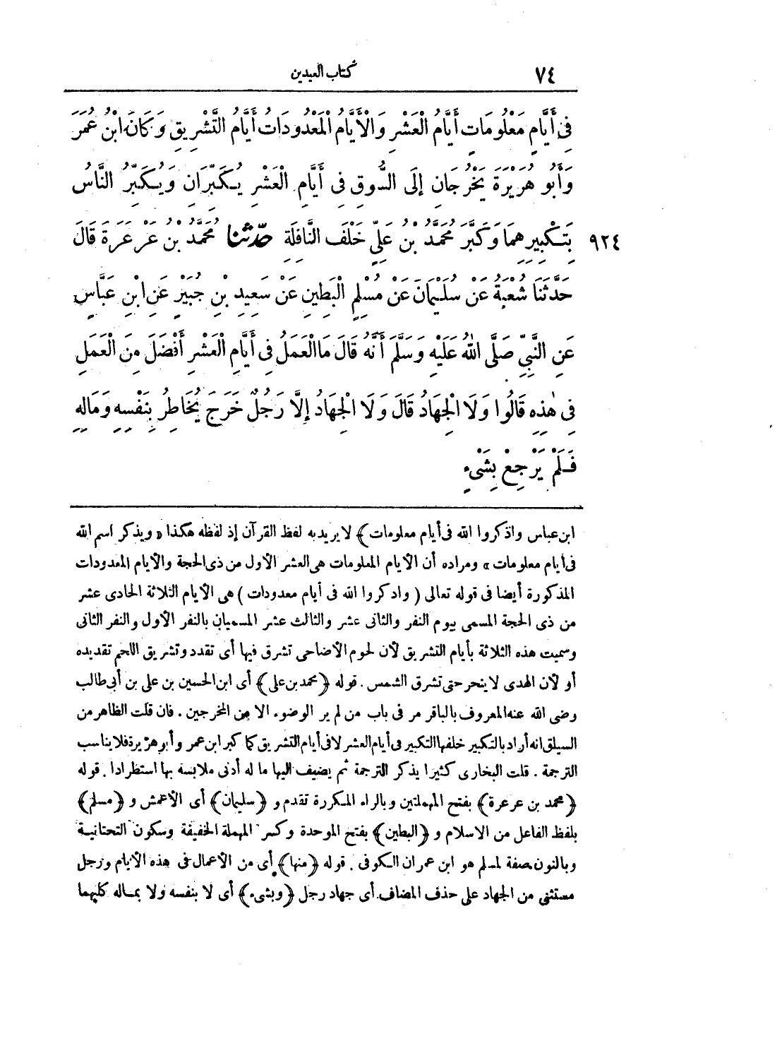 924 - حَدَّثَنَا مُحَمَّدُ بْنُ عَرْعَرَةَ قَالَ حَدَّثَنَا شُعْبَةُ عَنْ سُلَيْمَانَ عَنْ مُسْلِمٍ الْبَطِينِ عَنْ سَعِيدِ بْنِ جُبَيْرٍ عَنْ ابْنِ عَبَّاسٍ عَنْ النَّبِيِّ صَلَّى اللَّهُ عَلَيْهِ وَسَلَّمَ أَنَّهُ قَالَ مَا الْعَمَلُ فِي أَيَّامٍ أَفْضَلَ مِنْهَا فِي هَذِهِ قَالُوا وَلَا الْجِهَادُ قَالَ وَلَا الْجِهَادُ إِلَّا رَجُلٌ خَرَجَ يُخَاطِرُ بِنَفْسِهِ وَمَالِهِ فَلَمْ يَرْجِعْ بِشَيْءٍ