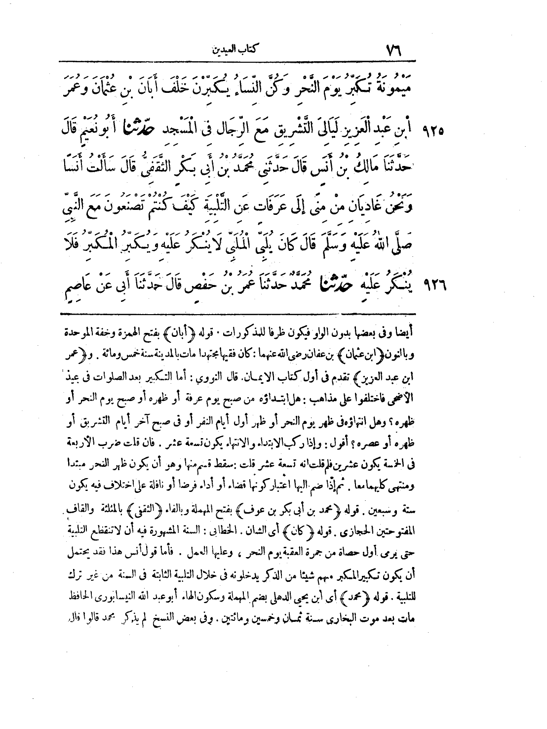 أيضا وفي بعضها بدون واو فيكون ظرفا للمذكورات, قوله ((أبان)) بفتح الهمزة وخفة الموحدة وبالنون ((ابن عثمان)) بن عفان رضي الله عنهما: كان فقيها مجتهدا مات بالمدينة سنة خمس ومائة, و ((عمر ابن عبد العزيز)) تقدم في أول كتاب الإيمان, قال النووي: أما التكبير بعد الصلوات في عيد الأضحى فاختلفوا على المذاهب: هل ابتداؤه من صبح يوم عرفة أو ظهره أو صبح يوم النحر أو ظهره؟ وهل انتهاؤه في ظهر يوم النحر أو ظهر اول أيام النفر أو في صبح آخر أيام التشريق أو ظهره أو عصره؟ أقول: وإذا ركب الابتداء والانتهاء يكون تسعة عشر, فإن قلت ضرب الأربعة في الخمسة يكون عشرين فلم قلت أنه تسعة عشر قلت: سقط قسم منها وهو أن يكون ظهر النحر مبتدأ ومنتهى كليهما معا, ثم إذا ضم إليها اعتبار كونها قضاء أو أداء فرضا أو نافلة على اختلاف فيه يكون ستة وسبعين, قوله ((محمد بن أبي بكر بن عوف)) بفتح المهملة وبالفاء ((الثقفي)) بالمثلثة والقاف المفتوحتين الحجازي, قوله ((كان)) أي الشأن, الخطابي: السنة المشهورة فيه أن لا تنقطع التلبية حتى يرمى أول حصاة من جمرة العقبة يوم النحر, وعليها العمل, فأما قول أنس هذا فقد يحتمل أن يكون تكبير المكبر مهم شيئا من الذكر يدخلونه في خلال التلبية الثابتة في السنة من غير ترك للتلبية, قوله ((محمد)) أي ابن يحي الدهلي بضم المهملة وسكون الهاء أبو عبد الله النيسابوري الحافظ مات بعد موت البخاري سنة ثمان وخمسين ومائتين , وفي بعض النسخ لم يذكر محمد قالوا قال