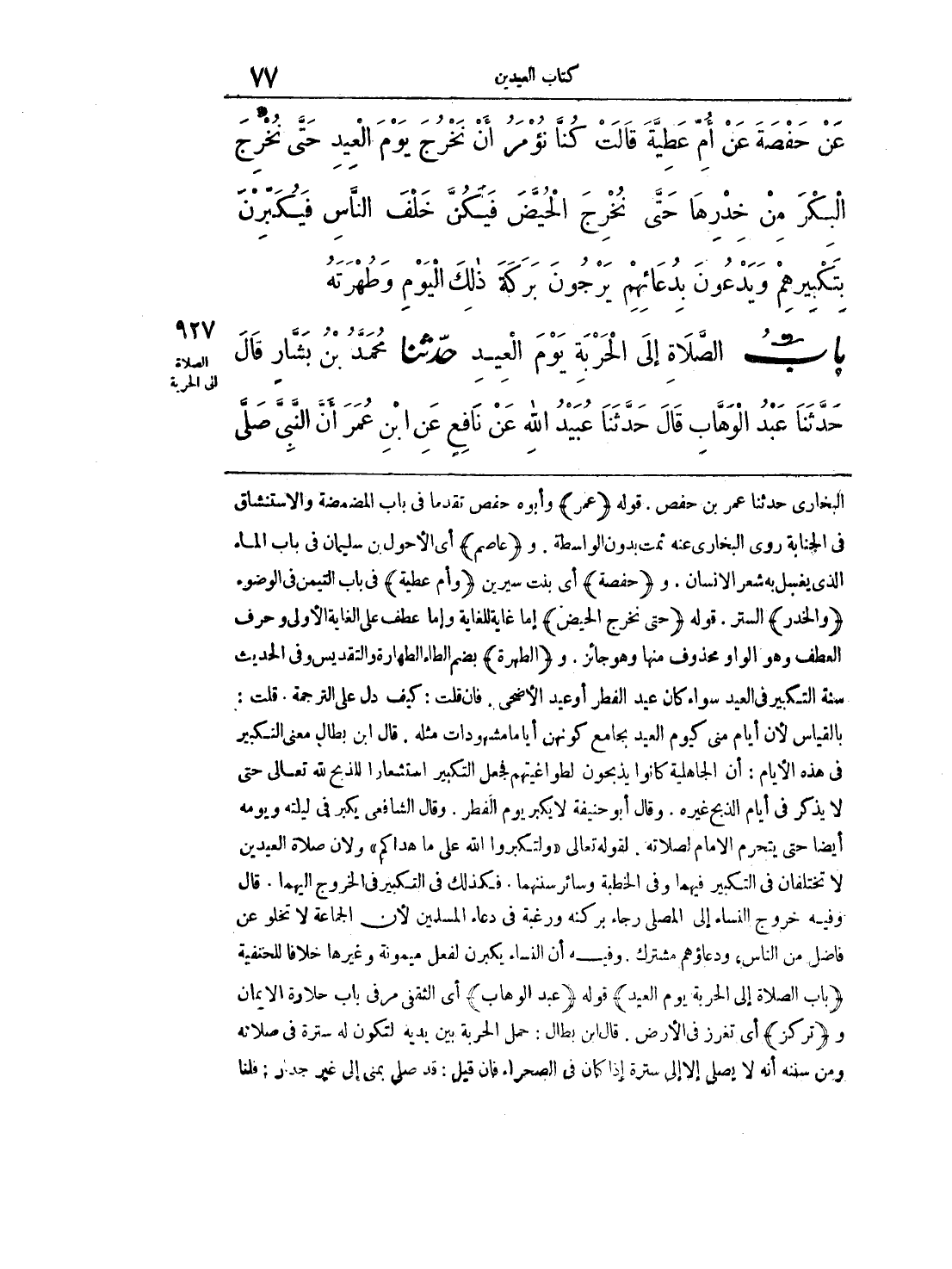 البخاري حدثنا عمر بن حفص, قوله ((عمر)) وأبوه حفص تقدما في باب المضمضة والاستنشاق في الجنابة روى البخاري عنه ثمت بدون الواسطة, و ((عاصم)) أي الأحول بن سليمان في باب الماء الذي يغسل به شعر الإنسان, و ((حفصة)) أي بنت سيرين, ((وأم عطية)) في باب التيمن في الوضوء, ((والخدر)) الستر, قوله ((حتى نخرج الحيض)) إما غاية للغاية وإما عطف على الغاية الأولى وحرف العطف وهو الواو محذوف منها وهو جائز, و ((الطهرة)) بضم الطاء الطهارة والتقديس وفي الحديث سنة التكبير في العيد سواء كان عيد الفطر أو عيد الأضحى, فإن قلت: كيف دل على الترجمة, قلت: بالقياس لأن أيام منى كيوم العيد بجامع كونهن أياما مشهودات مثله, قال ابن بطال معنى التكبير في هذه الأيام: أن الجاهلية كانوا يذبحون لطواغيتهم فجعل التكبير استشعارا للذبح لله تعالى حتى لا يذكر في أيام الذبح غيره, وقال أبو حنيفة لا يكبر يوم الفطر, وقال الشافعي يكبر في ليلته ويومه أيضا حتى يتحرم الإمام لصلاته, لقوله تعالى «ولتكبروا الله على ما هداكم» ولأن صلاة العيدين لا تختلفان في التكبير فيهما وفي الخطبة وسائر سننهما, فكذلك في التكبير في الخروج إليهما, قال وفيه خروج النساء إلى المصلى رجاء بركنه ورغبة في دعاء المسلمين لأن الجماعة لا تخلو عن فاضل من الناس, ودعاؤهم مشترك, وفيه أن النساء يكبرن لفعل ميمونة وغيرها خلافا للحنفية ((باب الصلاة إلى الحربة يوم العيد)) قوله ((عبد الوهاب)) أي الثقفي مر في باب حلاوة الإيمان و ((تركز)) أي تغرز في الأرض, قال ابن بطال: حمل الحربة بين يديه لتكون له سترة في صلاته ومن سننه أنه لا يصلي إلا إلى سترة إذا كان في الصحراء فإن قيل: قد صلى بمنى إلى غير جدار: قلنا