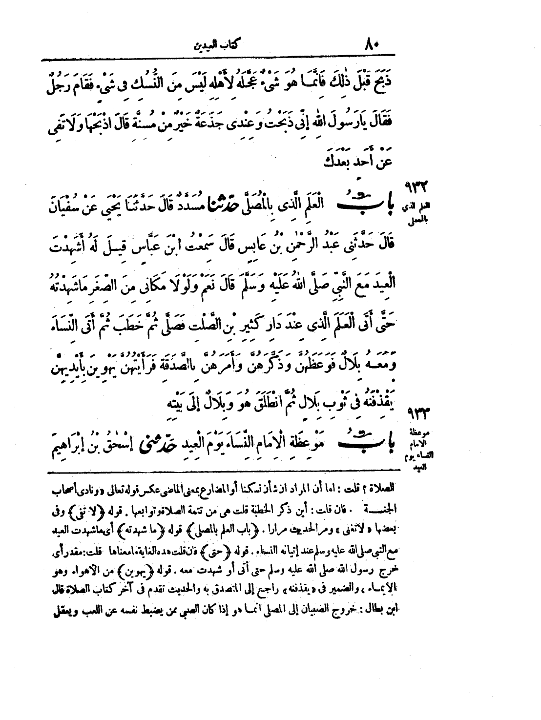 للصلاة؟ قلت: إما أن المراد إن شأن نسكنا أو المضارع بمعنى الماضي عكس قوله تعالى «ونادى أصحاب الجنة» , فإن قلت: أين ذكر الخطبة قلت هي من تتمة الصلاة وتوابعها, قوله ((لا تفي)) وفي بعضها «لا تفنى» ومر الحديث مرارا, ((باب العلم بالمصلى)) قوله ((ما شهدته)) أي ما شهدت العيد مع النبي صلى الله عليه وسلم عند إتيانه النساء, قوله ((حتى)) فإن قلت هذه الغاية ما معناها قلت: مقدر أي خرج رسول الله صلى الله عليه وسلم حتى أتى أو شهدت معه, قوله ((يهوين)) من الأهواء وهو الإيماء، والضمير في «يقذفنه» راجع إلى المتصدق به والحديث تقدم في آخر كتاب الصلاة قال ابن بطال: خروج الصبيان إلى المصلى إنما هو إذا كان الصبي ممن يضبط نفسه عن اللعب ويعقل