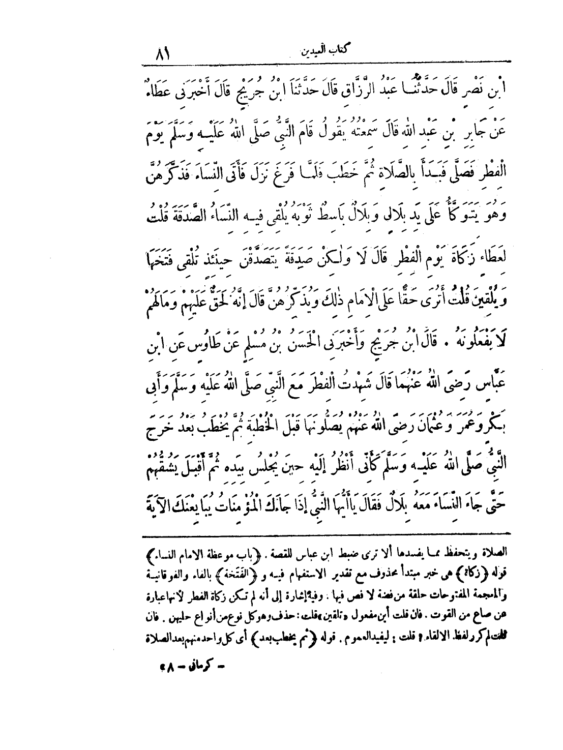 ابْنِ نَصْرٍ قَالَ حَدَّثَنَا عَبْدُ الرَّزَّاقِ قَالَ حَدَّثَنَا ابْنُ جُرَيْجٍ قَالَ أَخْبَرَنِي عَطَاءٌ عَنْ جَابِرِ بْنِ عَبْدِ اللَّهِ قَالَ سَمِعْتُهُ يَقُولُ قَامَ النَّبِيُّ صَلَّى اللَّهُ عَلَيْهِ وَسَلَّمَ يَوْمَ الْفِطْرِ فَصَلَّى فَبَدَأَ بِالصَّلَاةِ ثُمَّ خَطَبَ فَلَمَّا فَرَغَ نَزَلَ فَأَتَى النِّسَاءَ فَذَكَّرَهُنَّ وَهُوَ يَتَوَكَّأُ عَلَى يَدِ بِلَالٍ وَبِلَالٌ بَاسِطٌ ثَوْبَهُ يُلْقِي فِيهِ النِّسَاءُ الصَّدَقَةَ قُلْتُ لِعَطَاءٍ زَكَاةَ يَوْمِ الْفِطْرِ قَالَ لَا وَلَكِنْ صَدَقَةً يَتَصَدَّقْنَ حِينَئِذٍ تُلْقِي فَتَخَهَا وَيُلْقِينَ قُلْتُ أَتُرَى حَقًّا عَلَى الْإِمَامِ ذَلِكَ وَيُذَكِّرُهُنَّ قَالَ إِنَّهُ لَحَقٌّ عَلَيْهِمْ وَمَا لَهُمْ لَا يَفْعَلُونَهُ.
