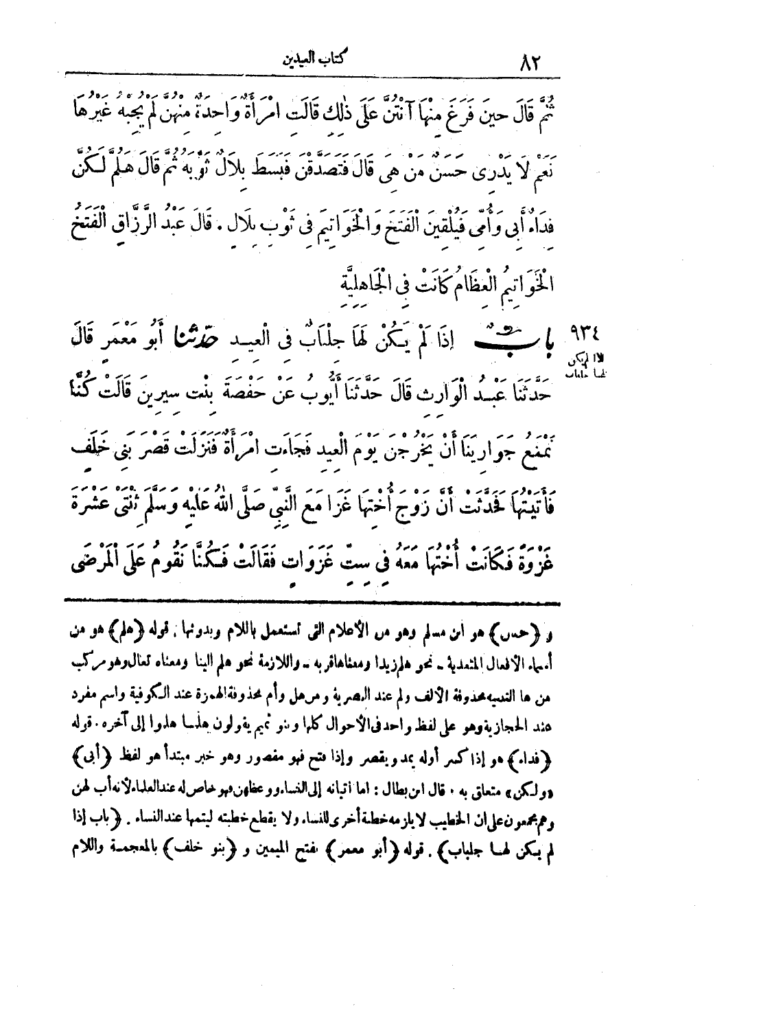934 - حَدَّثَنَا أَبُو مَعْمَرٍ قَالَ حَدَّثَنَا عَبْدُ الْوَارِثِ قَالَ حَدَّثَنَا أَيُّوبُ عَنْ حَفْصَةَ بِنْتِ سِيرِينَ قَالَتْ كُنَّا نَمْنَعُ جَوَارِيَنَا أَنْ يَخْرُجْنَ يَوْمَ الْعِيدِ فَجَاءَتْ امْرَأَةٌ فَنَزَلَتْ قَصْرَ بَنِي خَلَفٍ فَأَتَيْتُهَا فَحَدَّثَتْ أَنَّ زَوْجَ أُخْتِهَا غَزَا مَعَ النَّبِيِّ صَلَّى اللَّهُ عَلَيْهِ وَسَلَّمَ ثِنْتَيْ عَشْرَةَ غَزْوَةً فَكَانَتْ أُخْتُهَا مَعَهُ فِي سِتِّ غَزَوَاتٍ فَقَالَتْ فَكُنَّا نَقُومُ عَلَى الْمَرْضَى