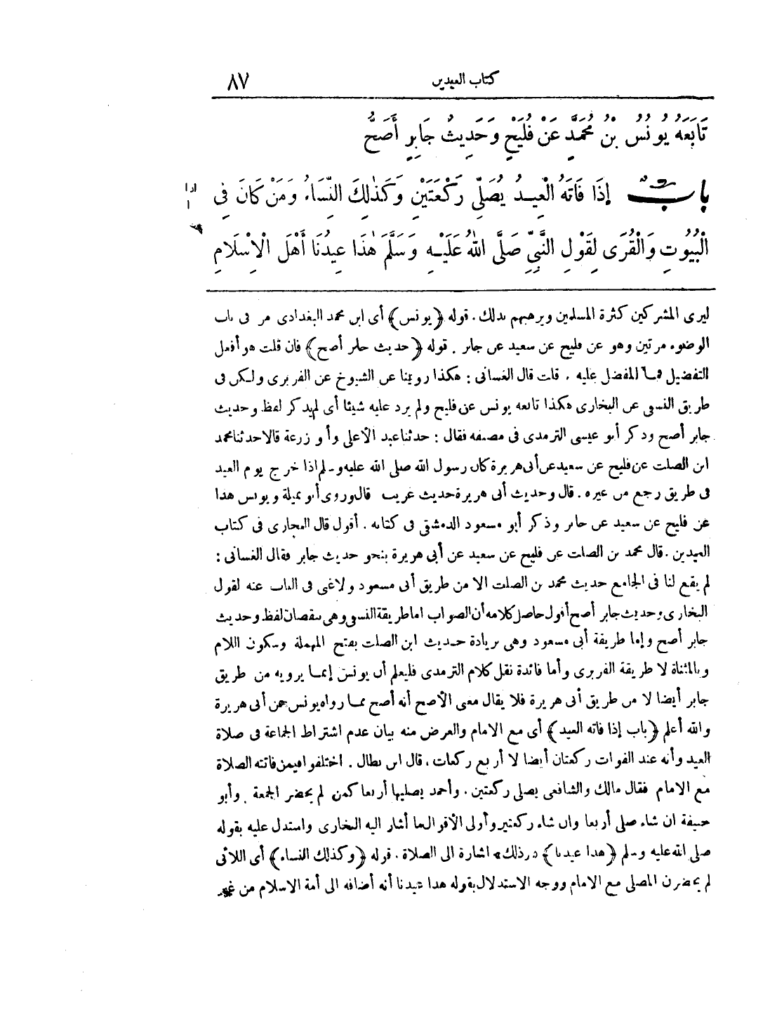ليرى المشركين كثرة المسلمين ويرهبهم بذلك, قوله ((يونس)) أي ابن محمد البغدادي مر في باب الوضوء مرتين وهو عن فليح عن سعيد عن جابر , قوله ((حديث جابر أصح)) فإن قلت هو أفعل التفضيل فما المفضل عليه, قلت قال الغساني: هكذا روينا عن الشيوخ عن الفريري ولكن في طريق النسفي عن البخاري هكذا تابعه يونس عن فليح ولم يرد عليه شيئا أي لم يذكر لفظ وحديث جابر أصح وذكر أبو عيسى الترمذي في مصنفه فقال: حدثنا عبد الأعلى وأوزرعة قالا حدثنا محمد ابن الصلت عن فليح عن سعيد عن أبي هريرة كان رسول الله صلى الله عليه وسلم إذا خرج يوم العيد في طريق رجع من غيره, قال وحديث أبي هريرة حديث غريب قال وروى أبو نميلة ويونس هذا عن سعيد عن جابر وذكر أبو مسعود الدمشقي في كتابه, أقول قال البخاري في كتاب العيدين, قال محمد بن الصلت عن فليح عن سعيد عن أبي هريرة بنحو حديث جابر فقال الغساني: لم يقع لنا في الجامع حديث محمد بن الصلت إلا من طريق أبي مسعود ولاغي في الباب عنه لقول البخاري وحديث جابر أصح أقول حاصل كلامه أن الصواب إما طريقة النسفي وهي نقصان لفظ وحديث جابر أصح وإما طريقة أبي مسعود وهي بزيادة حديث ابن الصلت بفتح المهملة وسكون اللام وبالمثناة لا طريقة الفريري وأما فائدة نقل كلام الترمذي فليعلم أن يونس إنما يرويه من طريق جابر أيضا لا من طريق أبي هريرة فلا يقال معي أنه أصح مما رواه يونس عن أبي هريرة والله أعلم ((باب إذا فاته العيد)) أي مع الإمام والعرض منه بيان عدم اشتراط الجماعة في صلاة العيد وأنه عند فوات ركعتان أيضا لا أربع ركعات, قال ابن بطال: اختلفوا فيمن فاتته الصلاة مع الإمام فقال مالك والشافعي يصلي ركعتين, وأحمد يصليها أربعا كمن لم يحضر الجمعة, وأبو حنيفة إن شاء الله ركعتين وأولى الأقوال ما أشار إليه البخاري واستدل عليه بقوله صلى الله عليه وسلم ((هذا عيدنا)) هو ذلك إشارة إلى الصلاة, قوله ((وكذلك النساء)) أي اللائي لم يحضرن المصلى مع الإمام ووجه الاستدلال بقوله هذا عيدنا أنه أضافه إلى أمة الإسلام من غير