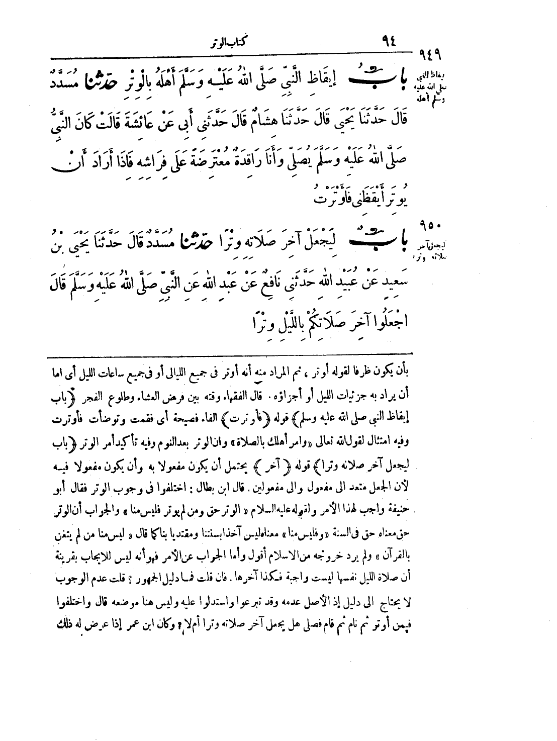 والجواب أن الوتر حق معناه حق في السنة «وفليس منا» معناه ليس آخذا بسنتنا ومقتديا بنا كما قال «ليس منا من لم يتغن بالقرآن» ولم يرد خروجه من الإسلام أقول وأما الجواب عن الأمر فهو أنه ليس للإيجاب بقرينة أن صلاة الليل نفسها ليست واجبة فكذا آخرها، فإن قلت فما دليل الجمهور؟ قلت عدم الوجوب لا يحتاج إلى دليل إذ الأصل عدمه وقد تبرعوا واستدلوا عليه وليس هنا موضعه قال واختلفوا فمن أوتر ثم نام ثم قام فصلى هل يجعل آخر صلاته وترا أم لا؟ وكان ابن عمر إذا عرض له ذلك