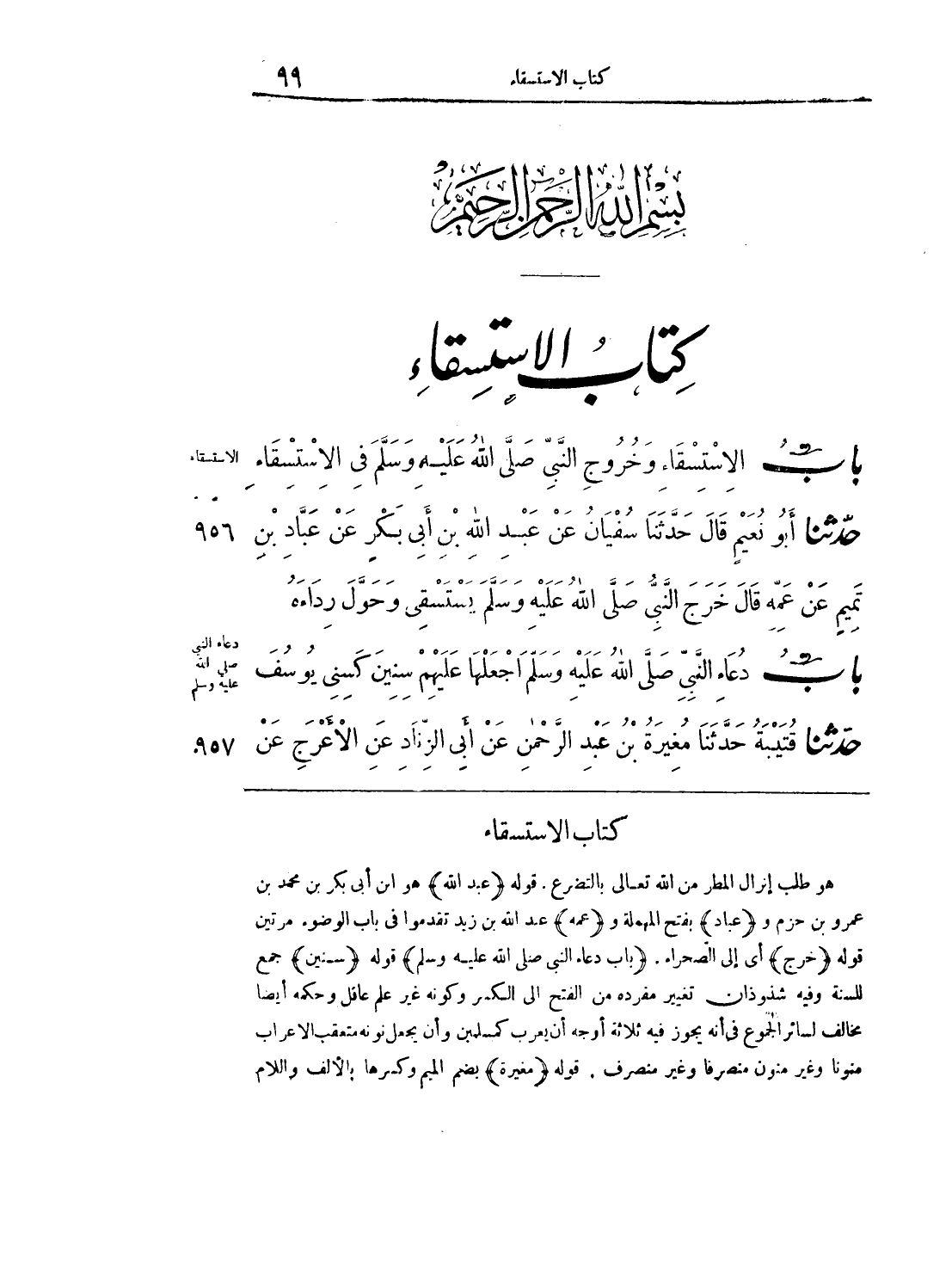 هو طلب إنزال المطر من الله تعالى بالتضرع، قوله ((عبد الله)) هو ابن أبي بكر بن محمد بن عمرو بن حازم و ((عباد)) بفتح المهملة و ((عمه)) عبد الله بن زيد تقدموا في باب الوضوء مرتين قوله ((خرج)) أي إلى الصحراء، ((باب دعاء النبي صلى الله عليه وسلم)) قوله ((سنين)) جمع للسنة وفيه شذوذان تغيير مفرده من الفتح إلى الكسر وكونه غير علم عاقل وحكمه أيضا مخالف لسائر الجموع في أنه يجوز فيه ثلاث أوجه أن يعرب كالمسلمين وأن يجعل نونه متعقب الإعراب منونا وغير منون منصرفا وغير منصرف، قوله ((مغيرة)) بضم الميم وكسرها وبالألف واللام