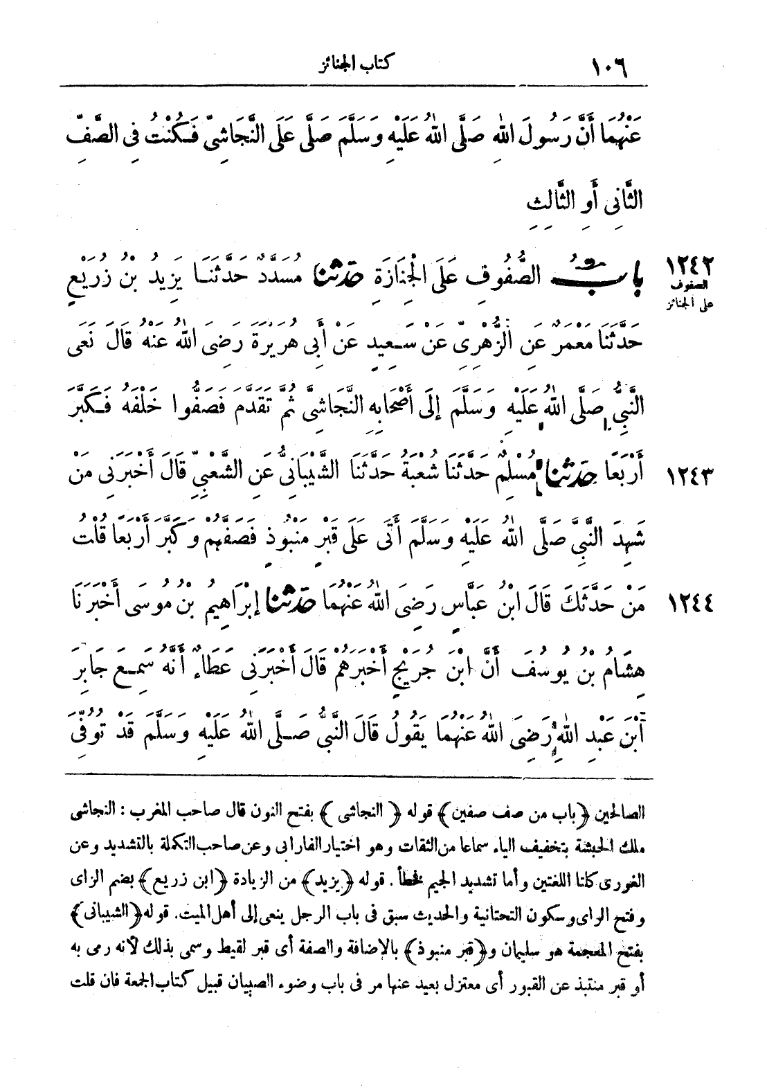 1243 - حَدَّثَنَا مُسْلِمٌ حَدَّثَنَا شُعْبَةُ حَدَّثَنَا الشَّيْبَانِىُّ عَنِ الشَّعْبِىِّ قَالَ أَخْبَرَنِى مَنْ شَهِدَ النَّبِىَّ صلى الله عليه وسلّم أَنَّهُ أَتَى عَلَى قَبْرٍ مَنْبُوذٍ فَصَفَّهُمْ وَكَبَّرَ أَرْبَعاً. قُلْتُ مَنْ حَدَّثَكَ قَالَ ابْنُ عَبَّاسٍ رضى الله عنهما.