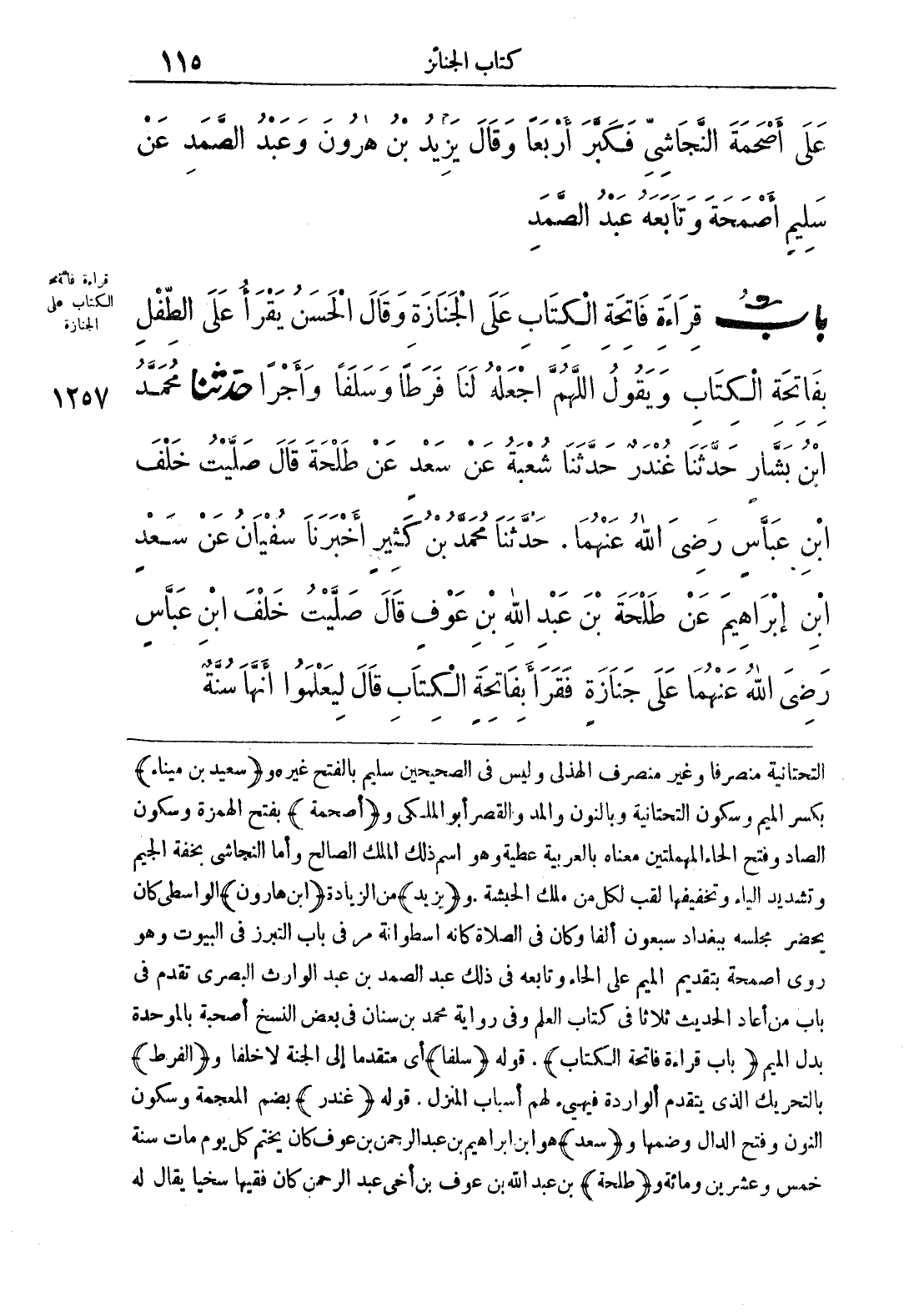 1257 - حَدَّثَنَا مُحَمَّدُ بْنُ بَشَّارٍ حَدَّثَنَا غُنْدَرٌ حَدَّثَنَا شُعْبَةُ عَنْ سَعْدٍ عَنْ طَلْحَةَ قَالَ صَلَّيْتُ خَلْفَ ابْنِ عَبَّاسٍ رضى الله عنهما. حَدَّثَنَا مُحَمَّدُ بْنُ كَثِيرٍ أَخْبَرَنَا سُفْيَانُ عَنْ سَعْدِ بْنِ إِبْرَاهِيمَ عَنْ طَلْحَةَ بْنِ عَبْدِ اللَّهِ بْنِ عَوْفٍ قَالَ صَلَّيْتُ خَلْفَ ابْنِ عَبَّاسٍ - رضى الله عنهما- عَلَى جَنَازَةٍ فَقَرَأَ بِفَاتِحَةِ الْكِتَابِ قَالَ لِيَعْلَمُوا أَنَّهَا سُنَّةٌ.