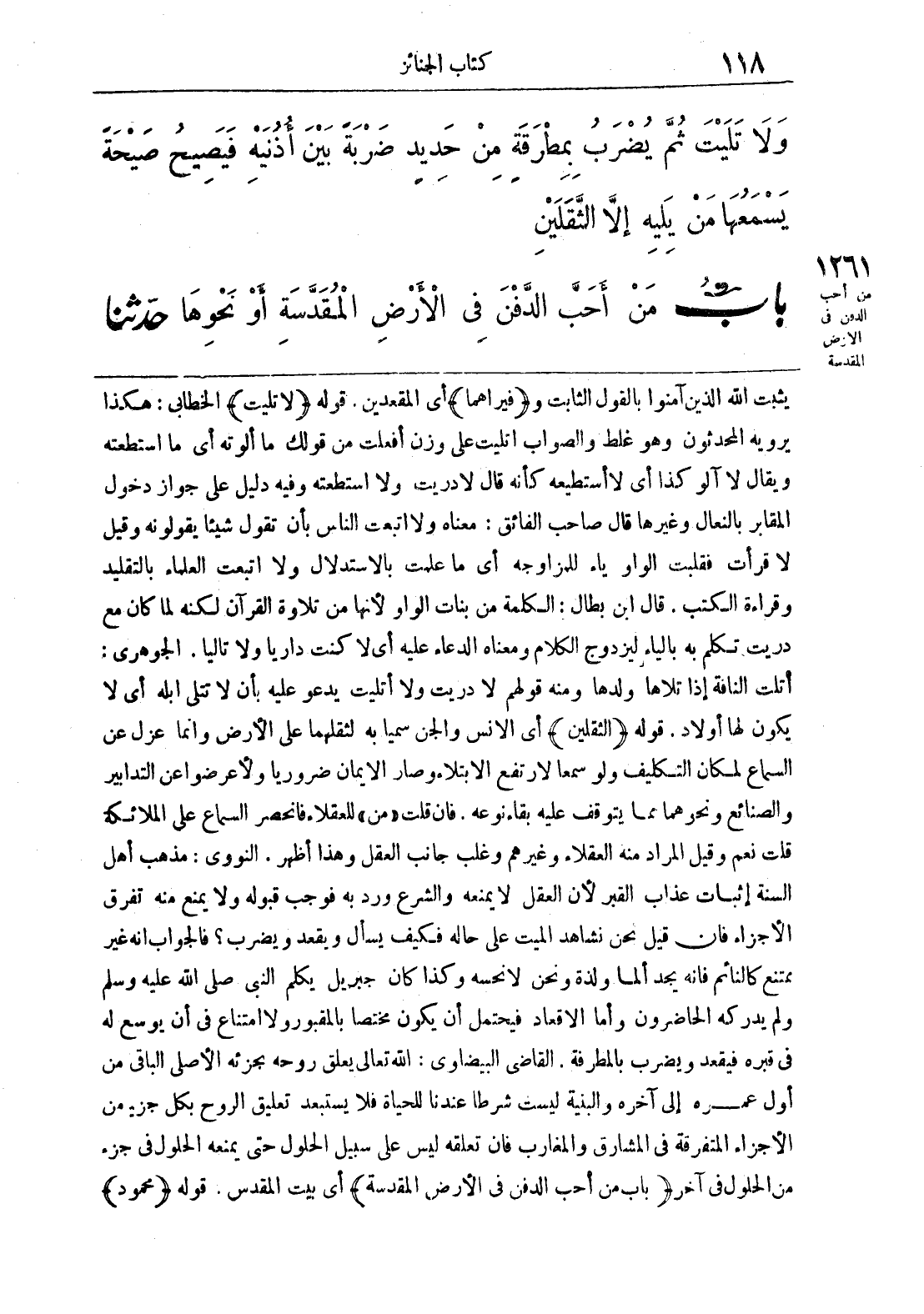 يثبت الله الذين آمنوا بالقول الثابت و (فيراهما) أي المقعدين. قوله (لا تليت) الخطابي: هكذا يرويه المحدثون وهو غلط والصواب أتليت على وزن أفعلت من قولك ما ألوته أي ما استطعته ويقال لا آلو كذا أي لا أستطيعه كأنه قال لا دريت ولا استطعته وفيه دليل على جواز دخول المقابر بالنعال وغيرها قال صاحب الفائق: معناه ولا اتبعت الناس بأن تقول شيئاً يقولونه وقيل لا قرأت فقلبت الواو ياء للمزاوجه أي ما علمت بالاستدلال ولا اتبعت العلماء بالتقليد وقراءة الكتب. قال ابن بطال: الكلمة من بنات الواو لأنها من تلاوة القرآن لكنه لما كان مع دريت تكلم به بالياء ليزدوج الكلام ومعناه الدعاء عليه أي لا كنت دارياً ولا تالياً. الجوهري: أتلت الناقة إذا تلاها ولدها ومنه قولهم لا دريت ولا أتليت يدعو عليه بأن لا تتلى أبله أي لا يكون لها أولاد. قوله (الثقلين) أي الإنس والجن سميا به لثقلهما على الأرض وإنما عزل عن السماع لمكان التكليف ولو سمعا لارتفع الابتلاء وصار الإيمان ضرورياً ولأعرضوا عن التدابير والصنائع ونحوهما مما يتوقف عليه بقاء نوعه. فإن قلت (من) للعقلاء فانحصر السماع على الملائكة قلت نعم وقيل المراد منه العقلاء وغيرهم وغلب جانب العقل وهذا أظهر. النووي: مذهب أهل السنة إثبات عذاب القبر لأن العقل لا يمنعه والشرع ورد به فوجب قبوله ولا يمنع منه تفرق الأجزاء فإن قيل نحن نشاهد الميت على حاله فكيف يسأل ويقعد ويضرب؟ فالجواب أنه غير ممتنع كالنائم فإنه يجد ألماً ولذة ونحن لا نحسه وكذا كان جبريل يكلم النبي صلى الله عليه وسلّم ولم يدركه الحاضرون وأما الاقعاد فيحتمل أن يكون مختصاً بالمقبور ولا امتناع في أن يوسع له في قبره فيقعد ويضرب بالمطرقة. القاضي البيضاوي: الله تعالى يعلق روحه بجزئه الأصلي الباقي من أول عمره إلى آخره والبنية ليست شرطاً عندنا للحياة فلا يستبعد تعليق الروح بكل جزء من الأجزاء المتفرقة في المشارق والمغارب فإن تعلقه ليس على سبيل الحلول حتى يمنعه الحلول في جزء من الحلول في آخر (باب من أحب الدفن في الأرض المقدسة) أي بيت المقدس. قوله (محمود)