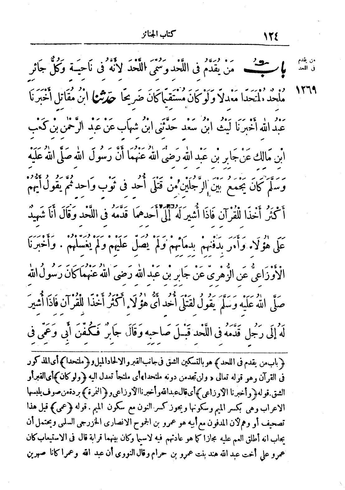 1269 - حَدَّثَنَا ابْنُ مُقَاتِلٍ أَخْبَرَنَا عَبْدُ اللَّهِ أَخْبَرَنَا لَيْثُ بْنُ سَعْدٍ حَدَّثَنِى ابْنُ شِهَابٍ عَنْ عَبْدِ الرَّحْمَنِ بْنِ كَعْبِ بْنِ مَالِكٍ عَنْ جَابِرِ بْنِ عَبْدِ اللَّهِ - رضى الله عنهما - أَنَّ رَسُولَ اللَّهِ صلى الله عليه وسلّم كَانَ يَجْمَعُ بَيْنَ الرَّجُلَيْنِ مِنْ قَتْلَى أُحُدٍ فِى ثَوْبٍ وَاحِدٍ ثُمَّ يَقُولُ «أَيُّهُمْ أَكْثَرُ أَخْذاً لِلْقُرْآنِ». فَإِذَا أُشِيرَ لَهُ إِلَى أَحَدِهِمَا قَدَّمَهُ فِى اللَّحْدِ وَقَالَ «أَنَا شَهِيدٌ عَلَى هَؤُلاَءِ». وَأَمَرَ بِدَفْنِهِمْ بِدِمَائِهِمْ، وَلَمْ يُصَلِّ عَلَيْهِمْ وَلَمْ يُغَسِّلْهُمْ. وَأَخْبَرَنَا الأَوْزَاعِىُّ عَنِ الزُّهْرِىِّ عَنْ جَابِرِ بْنِ عَبْدِ اللَّهِ - رضى الله عنهما - كَانَ رَسُولُ اللَّهِ صلى الله عليه وسلّم يَقُولُ لِقَتْلَى أُحُدٍ «أَىُّ هَؤُلاَءِ أَكْثَرُ أَخْذاً لِلْقُرْآنِ». فَإِذَا أُشِيرَ لَهُ إِلَى رَجُلٍ قَدَّمَهُ فِى اللَّحْدِ قَبْلَ صَاحِبِهِ. وَقَالَ جَابِرٌ فَكُفِّنَ أَبِى وَعَمِّى فِي