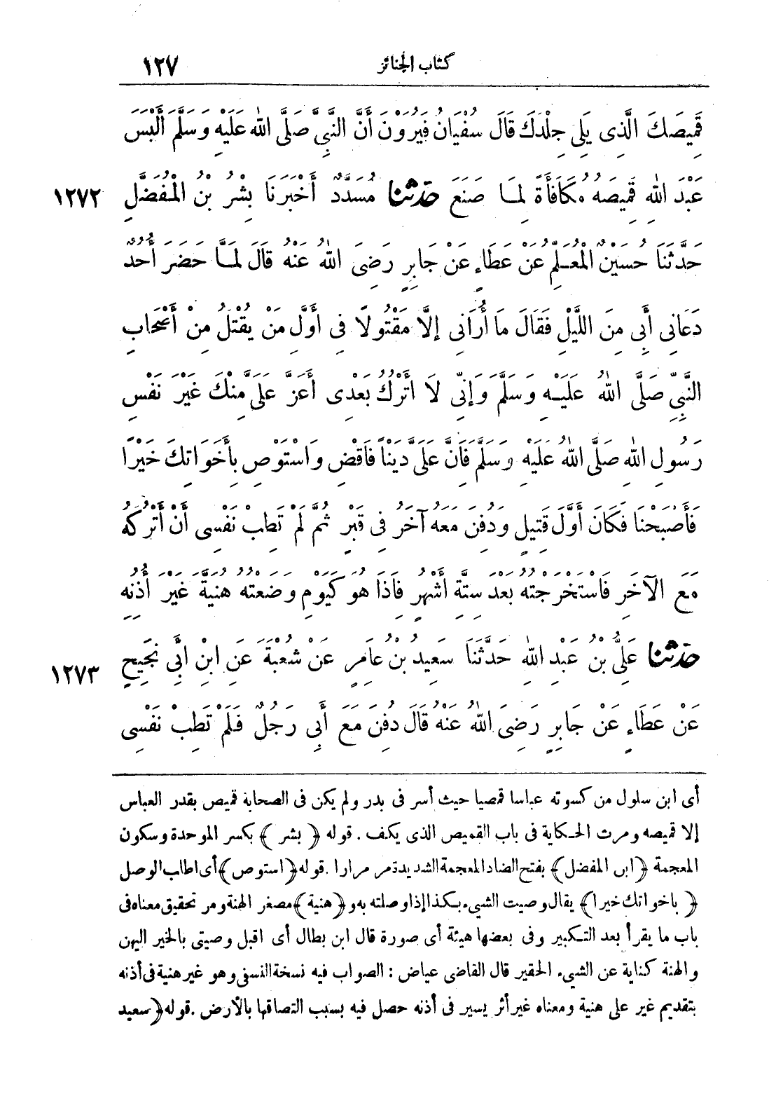 1272 - حَدَّثَنَا مُسَدَّدٌ أَخْبَرَنَا بِشْرُ بْنُ الْمُفَضَّلِ حَدَّثَنَا حُسَيْنٌ الْمُعَلِّمُ عَنْ عَطَاءٍ عَنْ جَابِرٍ - رضى الله عنه -قَالَ لَمَّا حَضَرَ أُحُدٌ دَعَانِى أَبِى مِنَ اللَّيْلِ فَقَالَ مَا أُرَانِى إِلاَّ مَقْتُولاً فِى أَوَّلِ مَنْ يُقْتَلُ مِنْ أَصْحَابِ النَّبِىِّ صلى الله عليه وسلّم، وَإِنِّى لاَ أَتْرُكُ بَعْدِى أَعَزَّ عَلَىَّ مِنْكَ، غَيْرَ نَفْسِ رَسُولِ اللَّهِ صلى الله عليه وسلّم، فَإِنَّ عَلَىَّ دَيْناً فَاقْضِ، وَاسْتَوْصِ بِأَخَوَاتِكَ خَيْراً. فَأَصْبَحْنَا فَكَانَ أَوَّلَ قَتِيلٍ، وَدُفِنَ مَعَهُ آخَرُ فِى قَبْرٍ، ثُمَّ لَمْ تَطِبْ نَفْسِى أَنْ أَتْرُكَهُ مَعَ الآخَرِ فَاسْتَخْرَجْتُهُ بَعْدَ سِتَّةِ أَشْهُرٍ، فَإِذَا هُوَ كَيَوْمِ وَضَعْتُهُ هُنَيَّةً غَيْرَ أُذُنِهِ.