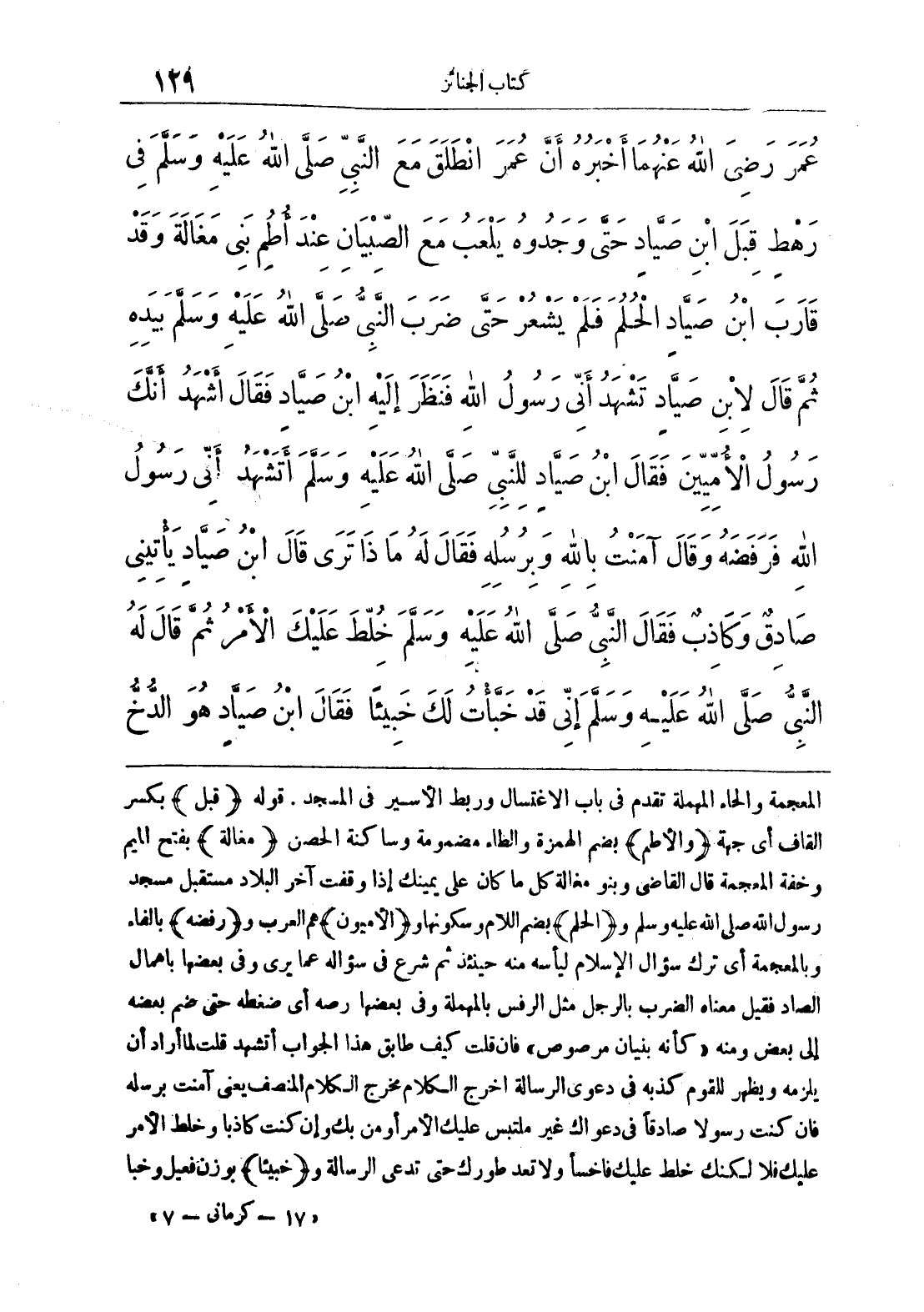 عُمَرَ - رضى الله عنهما - أَخْبَرَهُ أَنَّ عُمَرَ انْطَلَقَ مَعَ النَّبِىِّ صلى الله عليه وسلم فِى رَهْطٍ قِبَلَ ابْنِ صَيَّادٍ، حَتَّى وَجَدُوهُ يَلْعَبُ مَعَ الصِّبْيَانِ عِنْدَ أُطُمِ بَنِى مَغَالَةَ، وَقَدْ قَارَبَ ابْنُ صَيَّادٍ الْحُلُمَ فَلَمْ يَشْعُرْ حَتَّى ضَرَبَ النَّبِىُّ صلى الله عليه وسلّم بِيَدِهِ ثُمَّ قَالَ لاِبْنِ صَيَّادٍ «تَشْهَدُ أَنِّى رَسُولُ اللَّهِ». فَنَظَرَ إِلَيْهِ ابْنُ صَيَّادٍ فَقَالَ أَشْهَدُ أَنَّكَ رَسُولُ الأُمِّيِّينَ. فَقَالَ ابْنُ صَيَّادٍ لِلنَّبِىِّ صلى الله عليه وسلّم أَتَشْهَدُ أَنِّى رَسُولُ اللَّهِ فَرَفَضَهُ وَقَالَ آمَنْتُ بِاللَّهِ وَبِرُسُلِهِ. فَقَالَ لَهُ «مَاذَا تَرَى». قَالَ ابْنُ صَيَّادٍ يَاتِينِى صَادِقٌ وَكَاذِبٌ. فَقَالَ النَّبِىُّ صلى الله عليه وسلّم «خُلِّطَ عَلَيْكَ الأَمْرُ» ثُمَّ قَالَ لَهُ النَّبِىُّ صلى الله عليه وسلّم «إِنِّى قَدْ خَبَاتُ لَكَ خَبِيئاً». فَقَالَ ابْنُ صَيَّادٍ هُوَ الدُّخُّ