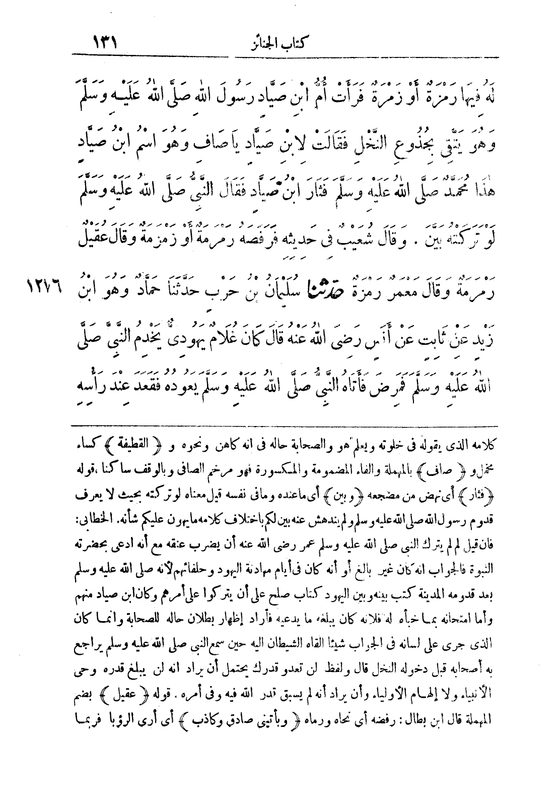 لَهُ فِيهَا رَمْزَةٌ أَوْ زَمْرَةٌ، فَرَأَتْ أُمُّ ابْنِ صَيَّادٍ رَسُولَ اللَّهِ صلى الله عليه وسلّم وَهُوَ يَتَّقِى بِجُذُوعِ النَّخْلِ فَقَالَتْ لاِبْنِ صَيَّادٍ يَا صَافِ- وَهْوَ اسْمُ ابْنِ صَيَّادٍ - هَذَا مُحَمَّدٌ صلى الله عليه وسلّم. فَثَارَ ابْنُ صَيَّادٍ فَقَالَ النَّبِىُّ صلى الله عليه وسلّم «لَوْ تَرَكَتْهُ بَيَّنَ». وَقَالَ شُعَيْبٌ فِى حَدِيثِهِ فَرَفَصَهُ رَمْرَمَةٌ، أَوْ زَمْزَمَةٌ. وَقَالَ إِسْحَاقُ الْكَلْبِىُّ وَعُقَيْلٌ رَمْرَمَةٌ. وَقَالَ مَعْمَرٌ رَمْزَةٌ.