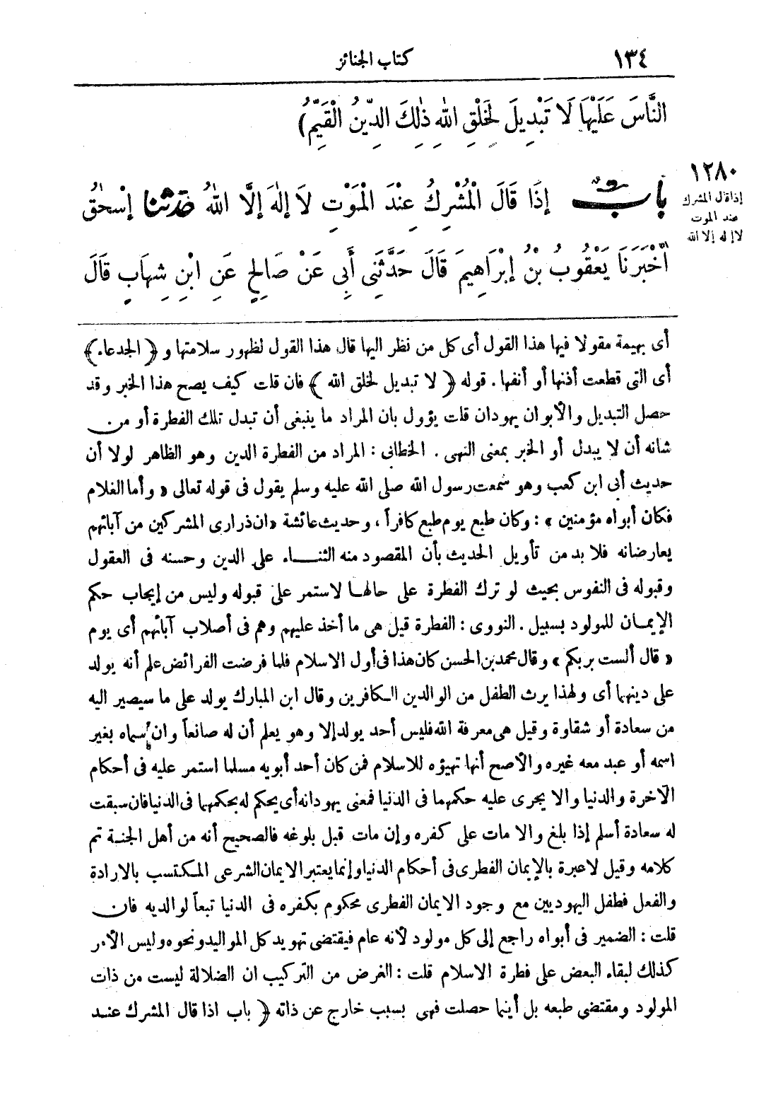 أي بهيمة مقولاً فيها هذا القول أي كل من نظر إليها قال هذا القول لظهور سلامتها و (الجدعاء) أي التي قطعت أذنها أو أنفها. قوله (لا تبديل لخلق الله) فإن قلت كيف يصح هذا الخبر وقد حصل التبديل والأبوان يهودان قلت يؤول بأن المراد ما ينبغي أن تبدل تلك الفطرة أو من شأنه أن لا يبدل أو الخبر بمعنى النهي. الخطابي: المراد من الفطرة الدين وهو الظاهر لولا أن حديث أبي ابن كعب وهو سمعت رسول الله صلى الله عليه وسلّم يقول في قوله تعالى (وأما الغلام فكان أبواه مؤمنين): وكان طبع يوم طبع كافراً، وحديث عائشة (أن ذراري المشركين من آبائهم يعارضانه فلابد من تأويل الحديث بأن المقصود منه الثناء على الدين وحسنه في العقول وقبول في النفوس بحيث لو ترك الفطرة على حالها لاستمر على قبوله وليس من إيجاب حكم الإيمان للمولود بسبيل. النووي: الفطرة قيل هي ما أخذ عليهم وهم في أصلاب آبائهم أي يوم (قال ألست بربكم) وقال محمد بن الحسن كان هذا في أول الإسلام فلما فرضت الفرائض علم أنه يولد على دينهما أي ولهذا يرث الطفل من الوالدين الكافرين وقال ابن المبارك يولد على ما سيصير إليه من سعادة أو شقاوة وقيل هي معرفة الله فليس أحد يولد إلا وهو يعلم أن له صانعاً وأن سماه بغير اسمه أو عبد معه غيره والأصح أنها تهيؤه للإسلام فمن كان أحد أبويه مسلماً استمر عليه في أحكام الآخرة والدنيا وألا يجري عليه حكمهما في الدنيا فمعنى يهودانه أي يحكم له بحكمهما في الدنيا فإن سبقت له سعادة أسلم إذا بلغ وإلا مات على كفره وإن مات قبل بلوغه فالصحيح أنه من أهل الجنة تم كلامه وقيل لا عبرة بالإيمان الفطري في أحكام الدنيا وإنما يعتبر الإيمان الشرعي المكتسب بالإرادة والفعل فطفل اليهوديين مع وجود الإيمان الفطري محكوم بكفره في الدنيا تبعاً لوالديه فإن قلت: الضمير في أبواه راجع إلى كل مولود لأنه عام فيقتضي تهويد كل المواليد ونحوه وليس الأمر كذلك لبقاء البعض على فطرة الإسلام قلت: الغرض من التركيب أن الضلالة ليست من ذات المولود ومقتضى طبعه بل أينما حصلت فهي بسبب خارج عن ذاته (باب إذا قال المشرك عند