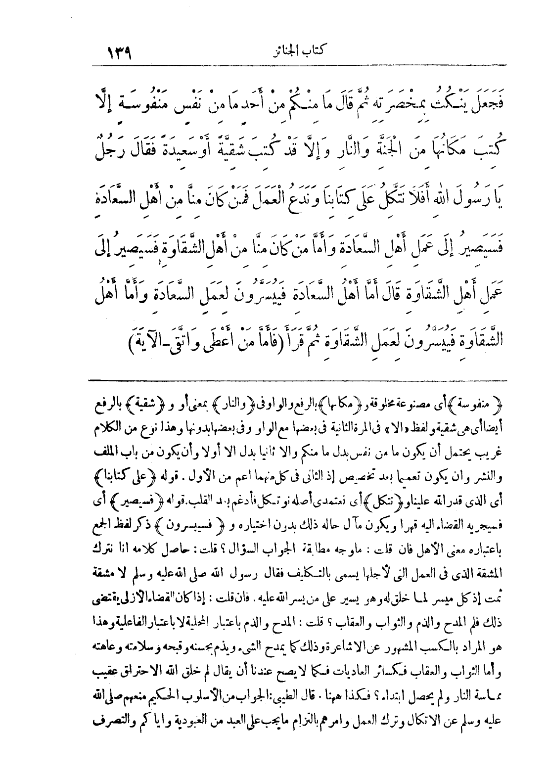 (منفوسة) أي مصنوعة مخلوقة و (مكانها) بالرفع والواو في (والنار) بمعنى أو و (شقية) بالرفع أيضاً أي هي شقية ولفظ (إلا) في المرة الثانية في بعضها مع الواو وفي بعضها بدونها وهذا نوع من الكلام غريب يحتمل أن يكون ما من نفس بدل ما منكم وإلا ثانياً بدل إلا أولاً وأن يكون من باب الملف والنشر وأن يكون تعميماً بعد تخصيص إذ الثاني في كل منهما أعم من الأول. قوله (على كتابنا) أي الذي قدر الله علينا و (نتكل) أي نعتمدي أصله نوتكل فأدغم بعد القلب. قوله (فسيصير) أي فسيجريه القضاء إليه قهراً ويكون مآل حاله ذلك بدون اختياره و (فسييسرون) ذكر لفظ الجمع باعتباره معنى الأهل فإن قلت: ما وجه مطابقة الجواب السؤال؟ قلت: حاصل كلامه أنا نترك المشقة الذي في العمل التي لأجلها يسمى بالتكليف فقال رسول الله صلى الله عليه وسلّم لا مشقة ثمت إذ كل ميسر لما خلق له وهو يسير على من يسر الله عليه. فإن قلت: إذا كان القضاء الأزلي يقتضي ذلك فلم المدح والذم والثواب والعقاب؟ قلت: المدح والذم باعتبار المحلية لا باعتبار الفاعلية وهذا هو المراد بالكسب لمشهور عن الأشاعرة وذلك كما يمدح الشيء ويذم بحسنه وقبحه وسلامته وعاهته وأما الثواب والعقاب فكسائر العاديات فكما لا يصح عندنا أن يقال لم خلق الله الاحتراق عقيب مماسة النار ولم يحصل ابتداء؟ فكذا هنا. قال الطيبي: الجواب من الأسلوب الكيم منعهم صلى الله عليه وسلّم عن الاتكال وترك العمل وأمرهم بالتزام ما يجب على العبد من العبودية وإياكم والتصرف