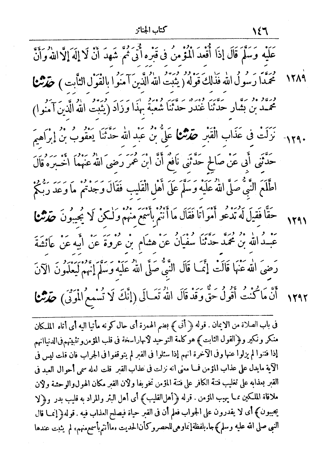 1290 - حَدَّثَنَا عَلِىُّ بْنُ عَبْدِ اللَّهِ حَدَّثَنَا يَعْقُوبُ بْنُ إِبْرَاهِيمَ حَدَّثَنِى أَبِى عَنْ صَالِحٍ حَدَّثَنِى نَافِعٌ أَنَّ ابْنَ عُمَرَ رضى الله عنهما أَخْبَرَهُ قَالَ اطَّلَعَ النَّبِىُّ صلى الله عليه وسلّم عَلَى أَهْلِ الْقَلِيبِ فَقَالَ «وَجَدْتُمْ مَا وَعَدَ رَبُّكُمْ حَقًّا». فَقِيلَ لَهُ تَدْعُو أَمْوَاتاً فَقَالَ «مَا أَنْتُمْ بِأَسْمَعَ مِنْهُمْ وَلَكِنْ لاَ يُجِيبُونَ».
