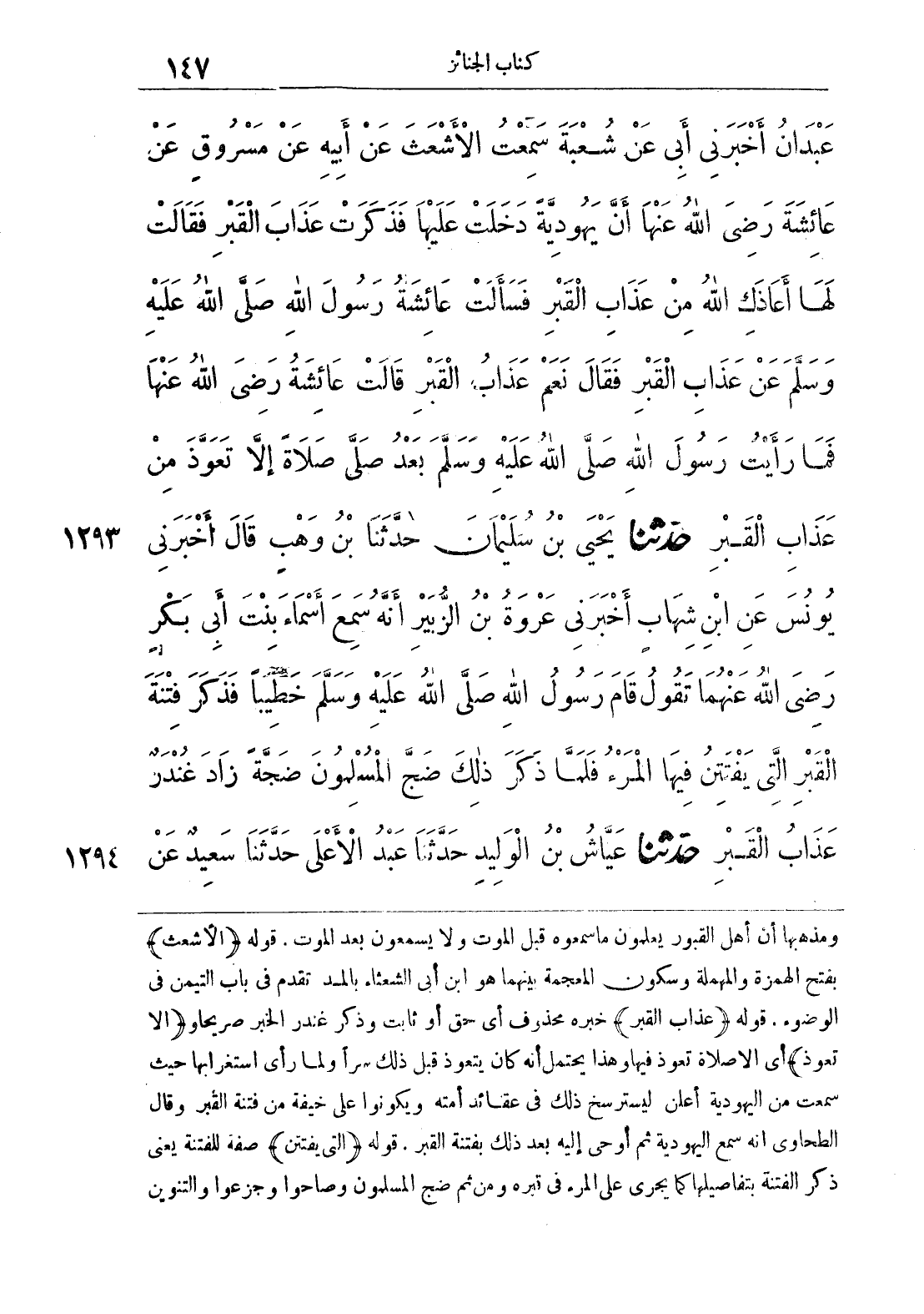 عَبْدَانُ أَخْبَرَنِى أَبِى عَنْ شُعْبَةَ سَمِعْتُ الأَشْعَثَ عَنْ أَبِيهِ عَنْ مَسْرُوقٍ عَنْ عَائِشَةَ رضى الله عنها أَنَّ يَهُودِيَّةً دَخَلَتْ عَلَيْهَا، فَذَكَرَتْ عَذَابَ الْقَبْرِ، فَقَالَتْ لَهَا أَعَاذَكِ اللَّهُ مِنْ عَذَابِ الْقَبْرِ فَسَأَلَتْ عَائِشَةُ رَسُولَ اللَّهِ صلى الله عليه وسلّم عَنْ عَذَابِ الْقَبْرِ فَقَالَ «نَعَمْ عَذَابُ الْقَبْرِ». قَالَتْ عَائِشَةُ رضى الله عنها فَمَا رَأَيْتُ رَسُولَ اللَّهِ صلى الله عليه وسلّم بَعْدُ صَلَّى صَلاَةً إِلاَّ تَعَوَّذَ مِنْ عَذَابِ الْقَبْرِ.