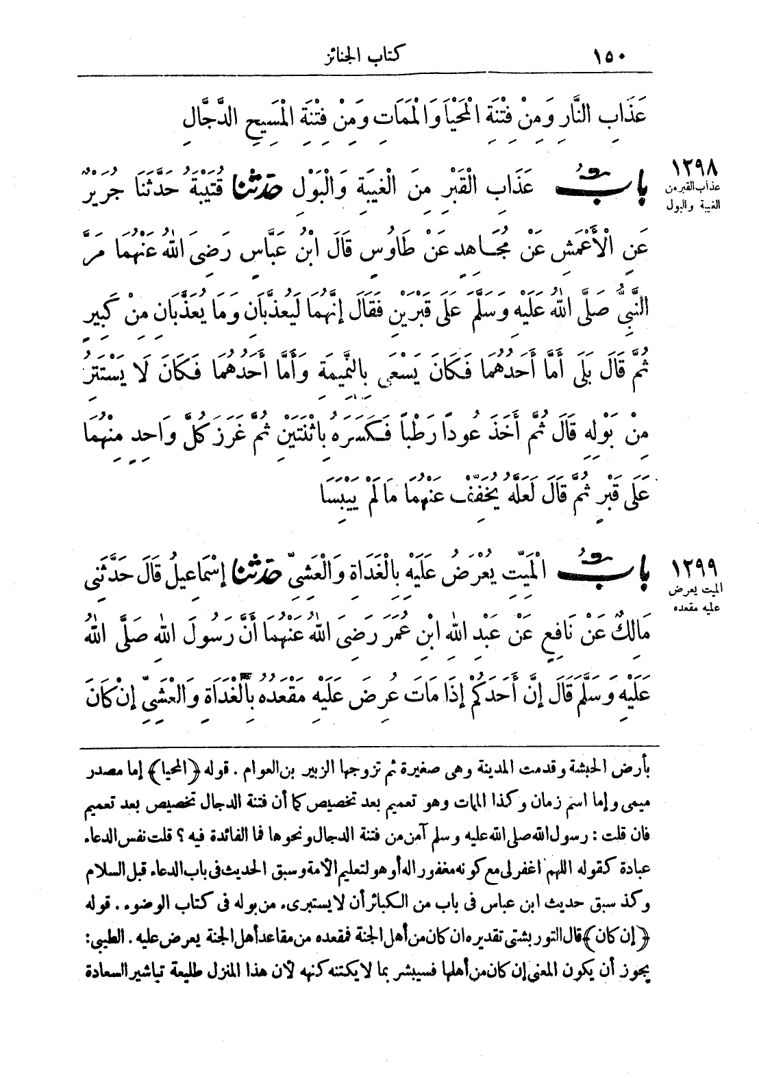 1299 - حَدَّثَنَا إِسْمَاعِيلُ قَالَ حَدَّثَنِى مَالِكٌ عَنْ نَافِعٍ عَنْ عَبْدِ اللَّهِ بْنِ عُمَرَ - رضى الله عنهما - أَنَّ رَسُولَ اللَّهِ صلى الله عليه وسلّم قَالَ «إِنَّ أَحَدَكُمْ إِذَا مَاتَ عُرِضَ عَلَيْهِ مَقْعَدُهُ بِالْغَدَاةِ وَالْعَشِىِّ إِنْ كَانَ