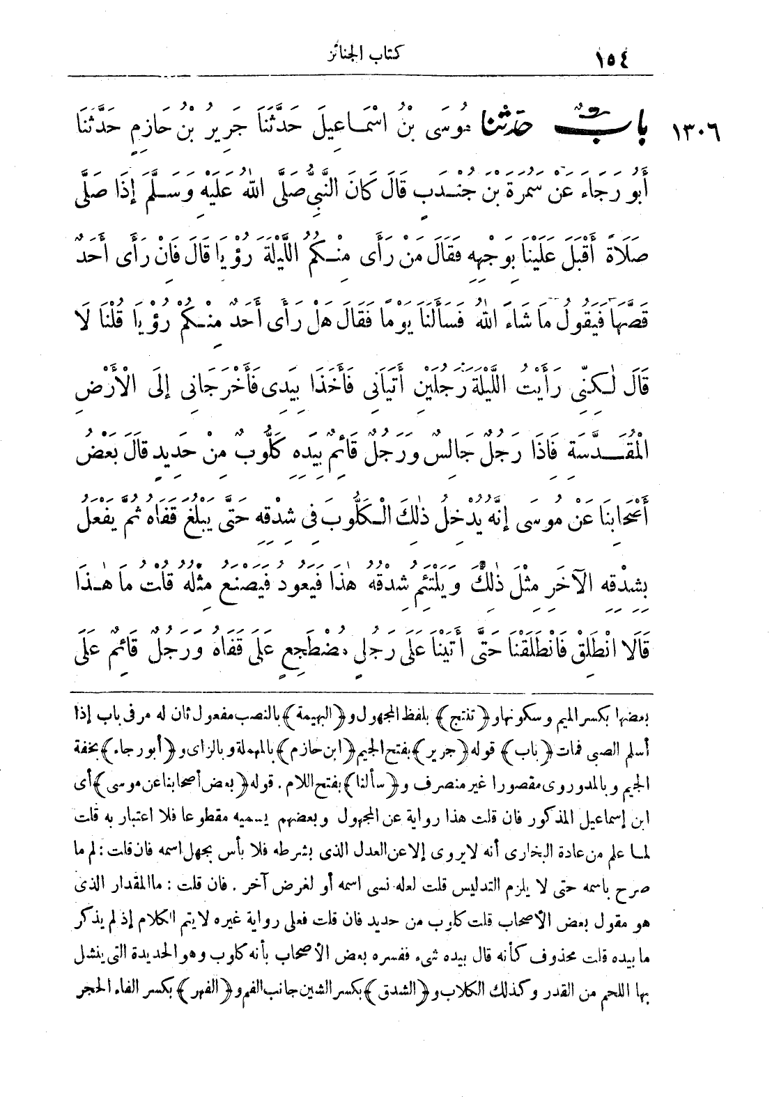 1306 - حَدَّثَنَا مُوسَى بْنُ إِسْمَاعِيلَ حَدَّثَنَا جَرِيرُ بْنُ حَازِمٍ حَدَّثَنَا أَبُو رَجَاءٍ عَنْ سَمُرَةَ بْنِ جُنْدَبٍ قَالَ كَانَ النَّبِىُّ صلى الله عليه وسلّم إِذَا صَلَّى صَلاَةً أَقْبَلَ عَلَيْنَا بِوَجْهِهِ فَقَالَ «مَنْ رَأَى مِنْكُمُ اللَّيْلَةَ رُؤْيَا». قَالَ فَإِنْ رَأَى أَحَدٌ قَصَّهَا، فَيَقُولُ مَا شَاءَ اللَّهُ، فَسَأَلَنَا يَوْماً، فَقَالَ «هَلْ رَأَى أَحَدٌ مِنْكُمْ رُؤْيَا». قُلْنَا لاَ. قَالَ «لَكِنِّى رَأَيْتُ اللَّيْلَةَ رَجُلَيْنِ أَتَيَانِى فَأَخَذَا بِيَدِى، فَأَخْرَجَانِى إِلَى الأَرْضِ الْمُقَدَّسَةِ، فَإِذَا رَجُلٌ جَالِسٌ، وَرَجُلٌ قَائِمٌ بِيَدِهِ كَلُّوبٌ مِنْ حَدِيدٍ - قَالَ بَعْضُ أَصْحَابِنَا عَنْ مُوسَى إِنَّهُ - يُدْخِلُ ذَلِكَ الْكَلُّوبَ فِى شِدْقِهِ، حَتَّى يَبْلُغَ قَفَاهُ، ثُمَّ يَفْعَلُ بِشِدْقِهِ الآخَرِ مِثْلَ ذَلِكَ، وَيَلْتَئِمُ شِدْقُهُ هَذَا، فَيَعُودُ فَيَصْنَعُ مِثْلَهُ. قُلْتُ مَا هَذَا قَالاَ انْطَلِقْ. فَانْطَلَقْنَا حَتَّى أَتَيْنَا عَلَى رَجُلٍ مُضْطَجِعٍ عَلَى قَفَاهُ وَرَجُلٌ قَائِمٌ عَلَى